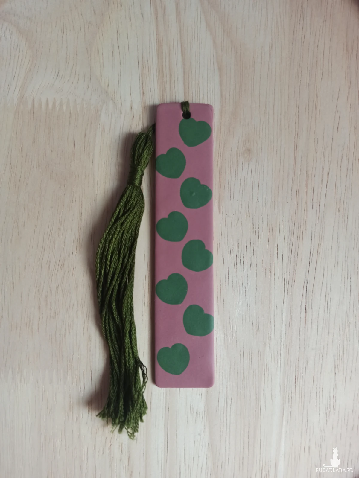 Zakładka do książki wykonana z wysokiej jakości gliny polimerowej w kolorze brudnego różu z serduszkami w kolorze ciemnej zieleni.