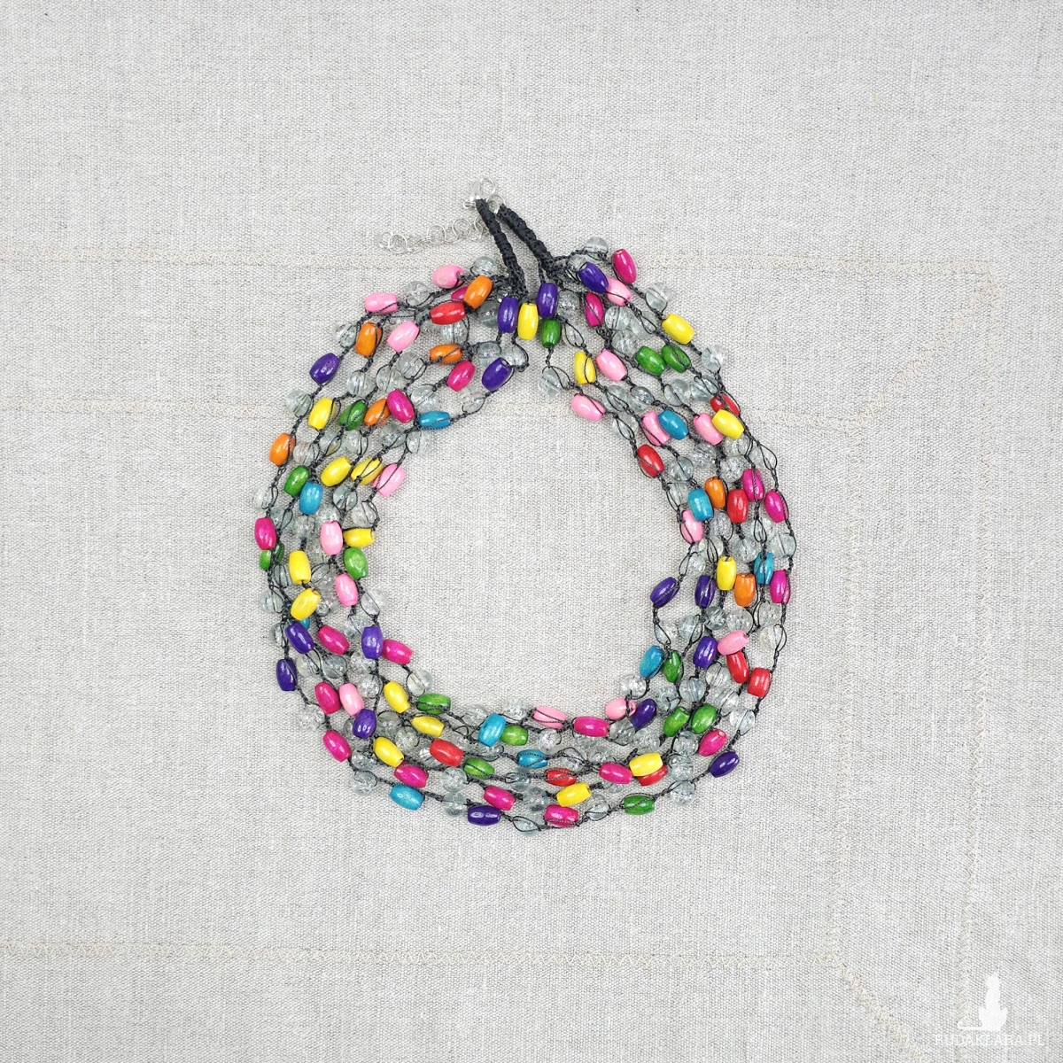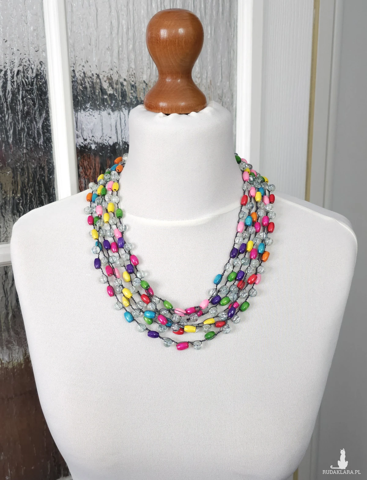 Lekki, wielorzędowy naszyjnik wykonany z kolorowych, drewnianych koralików przeplatanych przezroczystymi elementami o strukturze spękanego szkła.