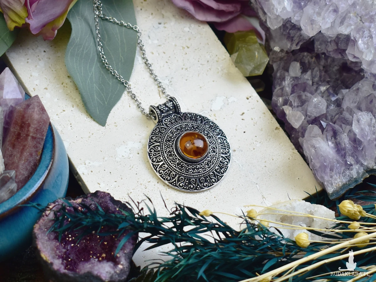 Wisiorek z bursztynem, wykonany z miedzi, która została posrebrzona tradycyjnymi technikami jubilerskimi. Bursztyn, z jego ciepłymi, złocistymi odcieniami, doskonale komponuje się z elegancką oprawą, tworząc harmonijną całość. Kamień ten od wieków uchodzi za symbol zdrowia, ochrony oraz energii. Biżuteria nie tylko ozdabia, ale i dodaje pewności siebie, będąc doskonałym wyborem na wyjątkowe okazje.