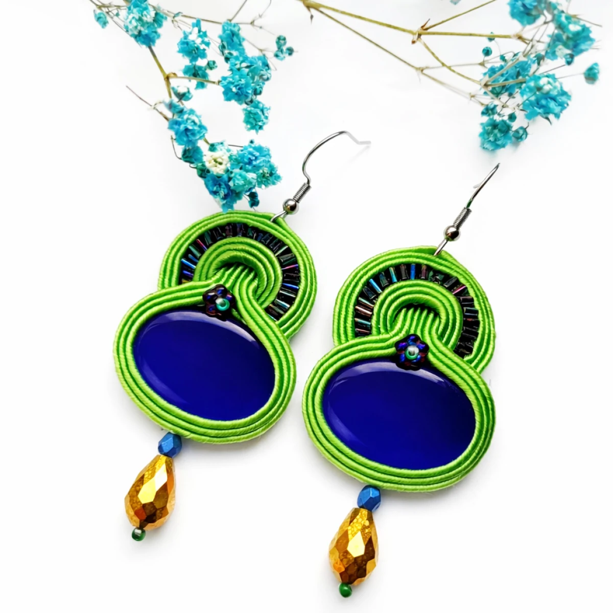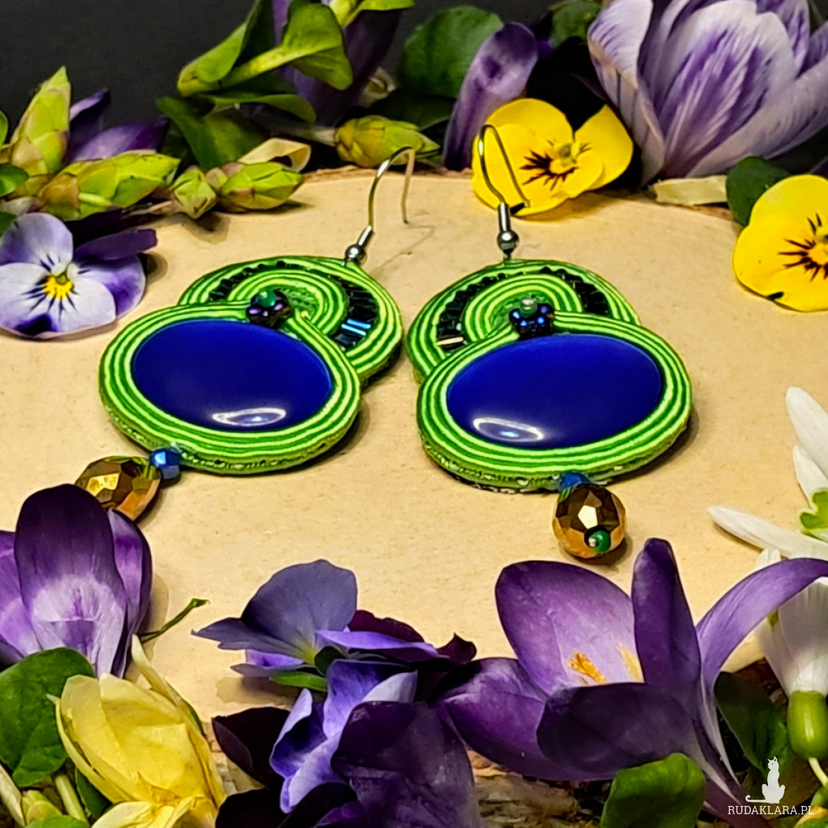 Te wyjątkowe kolczyki zostały wykonane ręcznie techniką haftu soutache (sutasz). Centralnym elementem kompozycji jest efektowny kaboszon typu „kocie oko” w intensywnym chabrowym kolorze, który pięknie odbija światło i nadaje biżuterii elegancji.