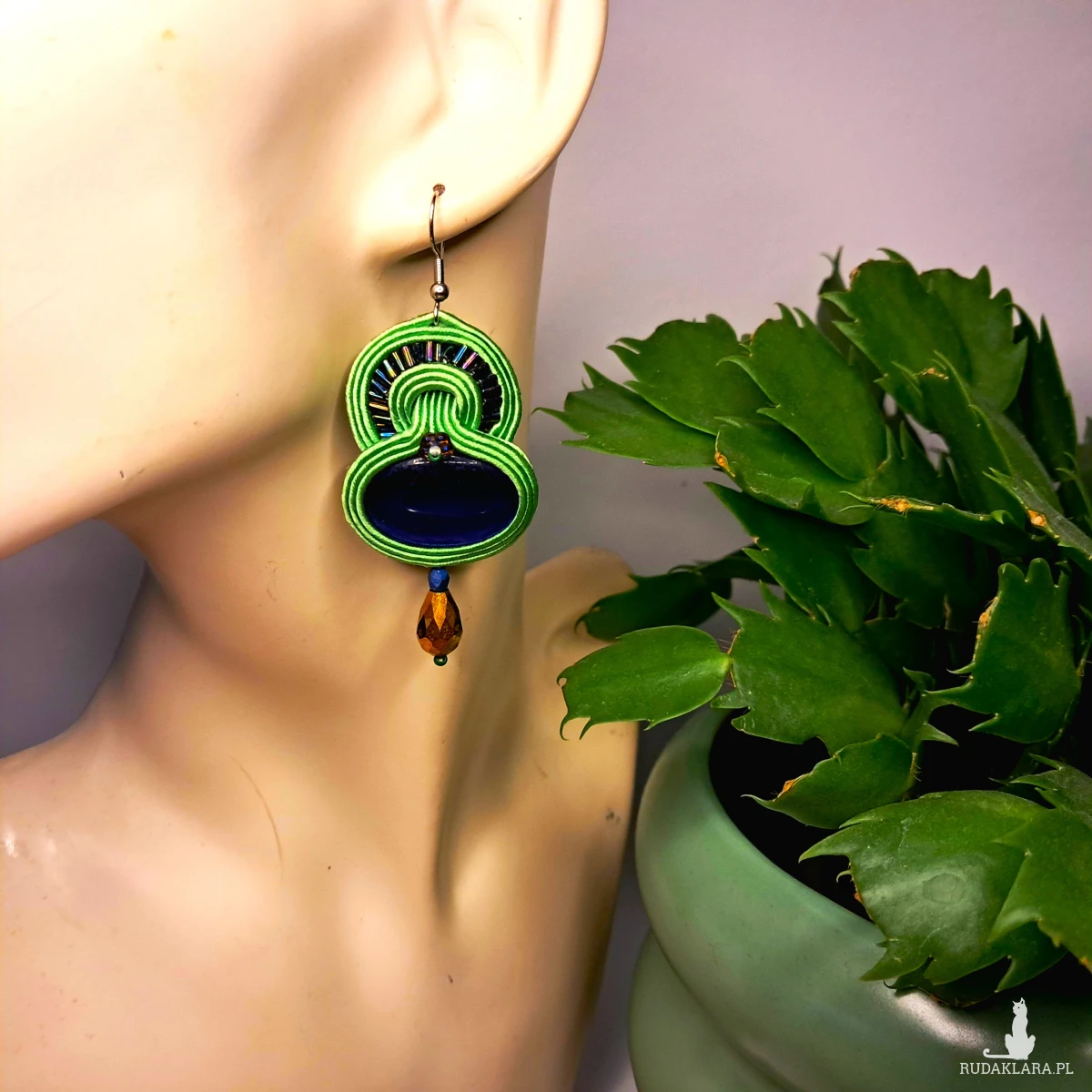 Te niezwykłe długie kolczyki zostały wykonane techniką sutasz, która pozwala tworzyć misterne i eleganckie formy. Połączenie intensywnej zieleni z głębokim turkusem nadaje biżuterii wyrazisty, a zarazem harmonijny charakter.