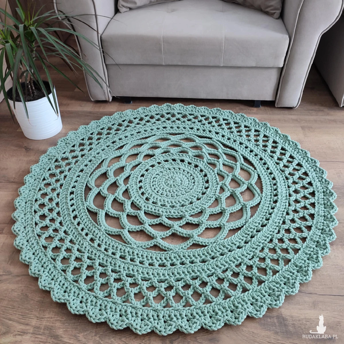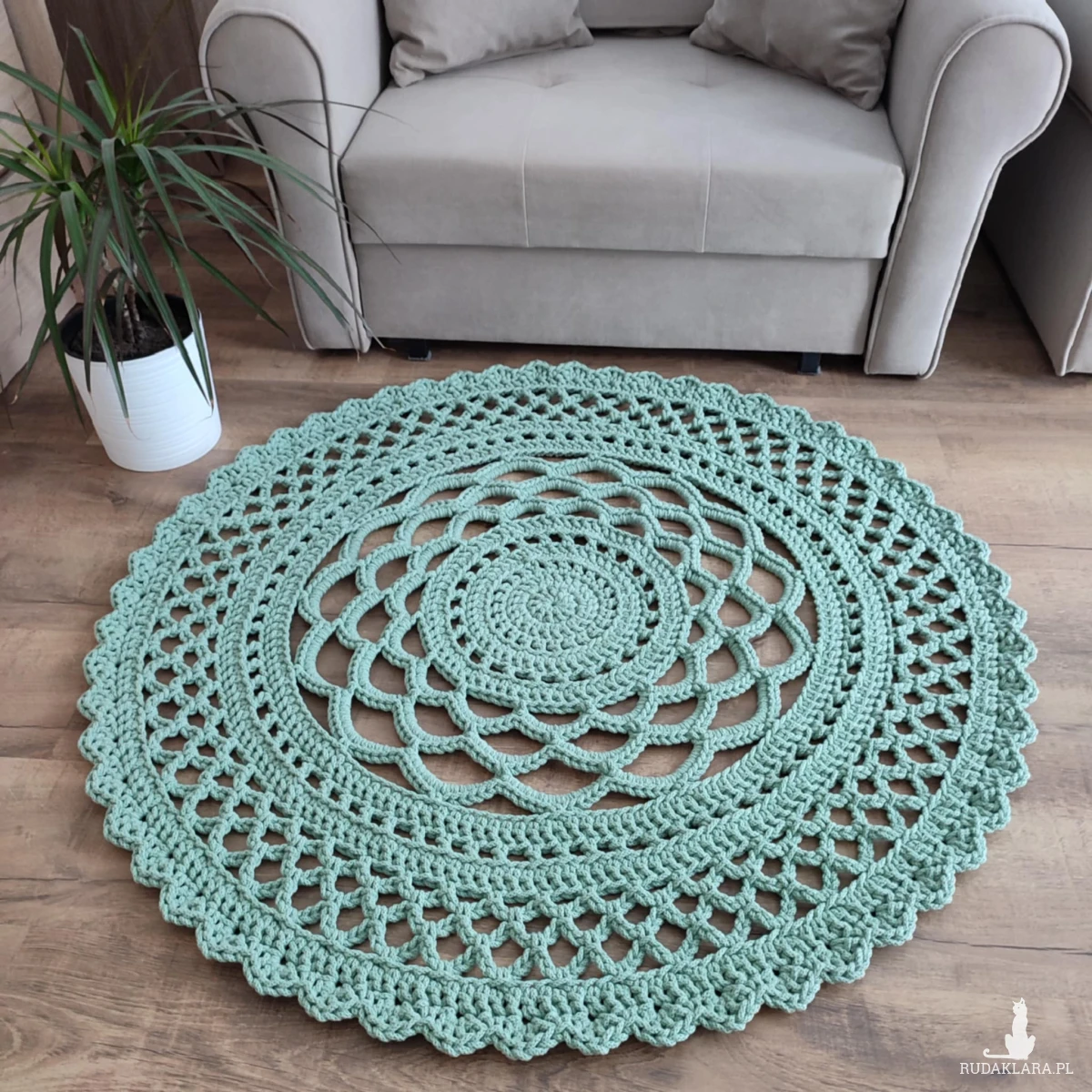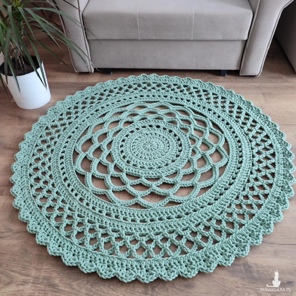Dywan o średnicy 110cm, wykonany metodą szydełkowania z polskiego sznurka bawełnianego 5mm.