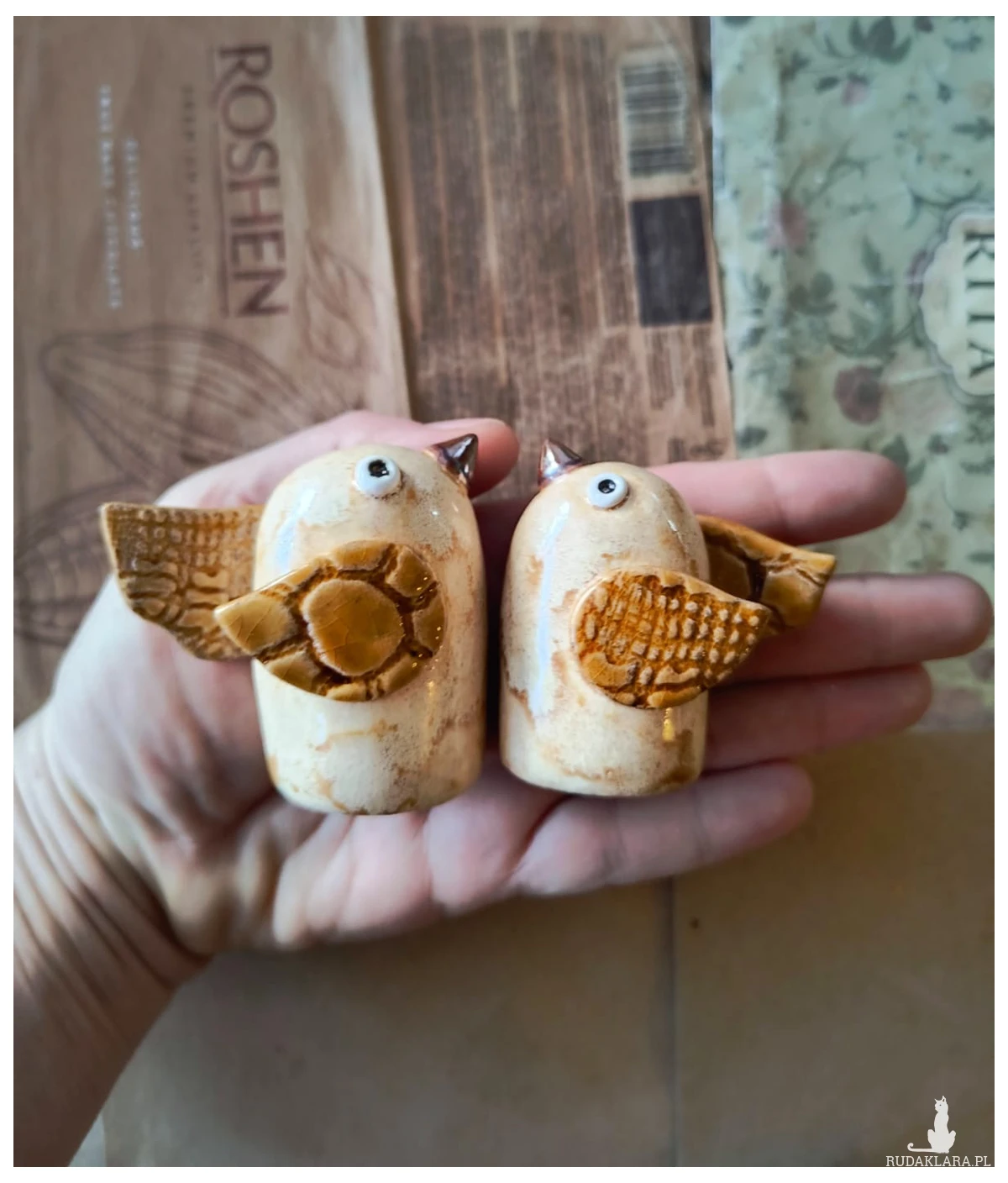 Zestaw 2 ptaszków ceramicznych w kolorze biszkoptowym o wymiarach ok 3,5 cm x 5,5 cm oraz 4 cm x 6,5 cm. Dostępne również osobno. Polecam serdecznie.