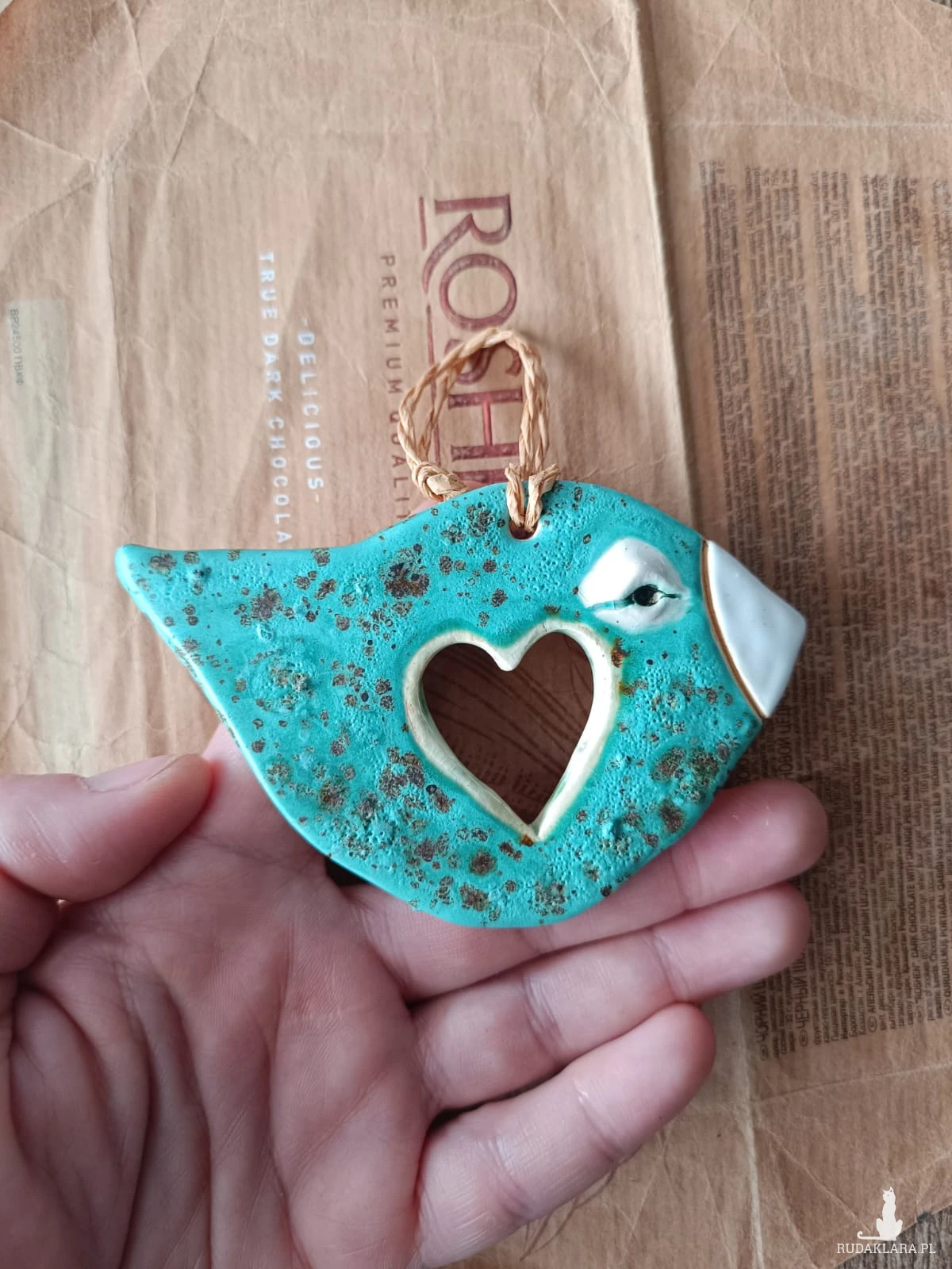 Ptaszek ceramiczny wykonany z gliny szamotowej, wypalony na biskwit, a następnie szkliwiony w temperaturze 1260 stopni C. Ptaszek przeznaczony jest do powieszenia. Długość ok 12 cm. Idealne jako upominek lub do ozdoby domu. Polecam!!!