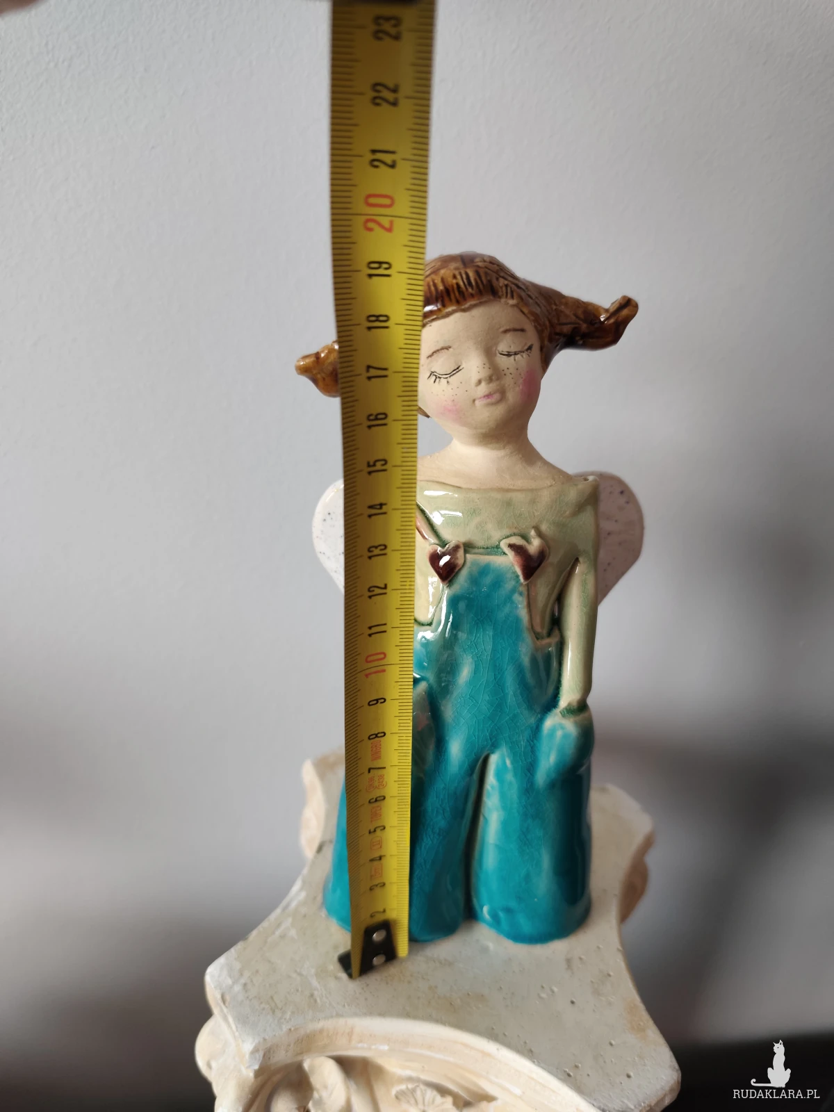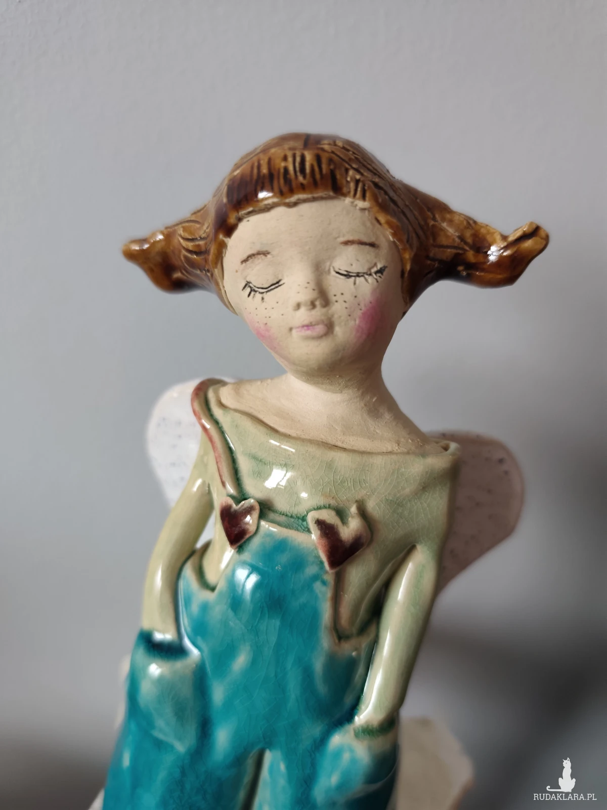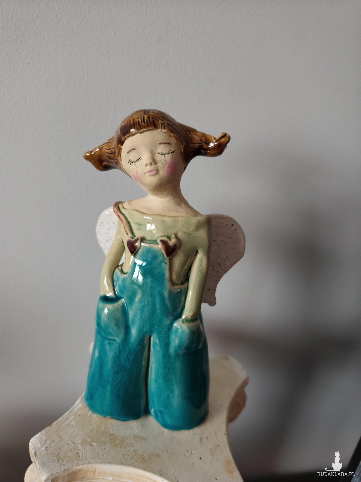 Anioł ceramiczny w ogrodniczkach ... Szuka domu. Rękodzieło ... dlatego niepowtarzalny.