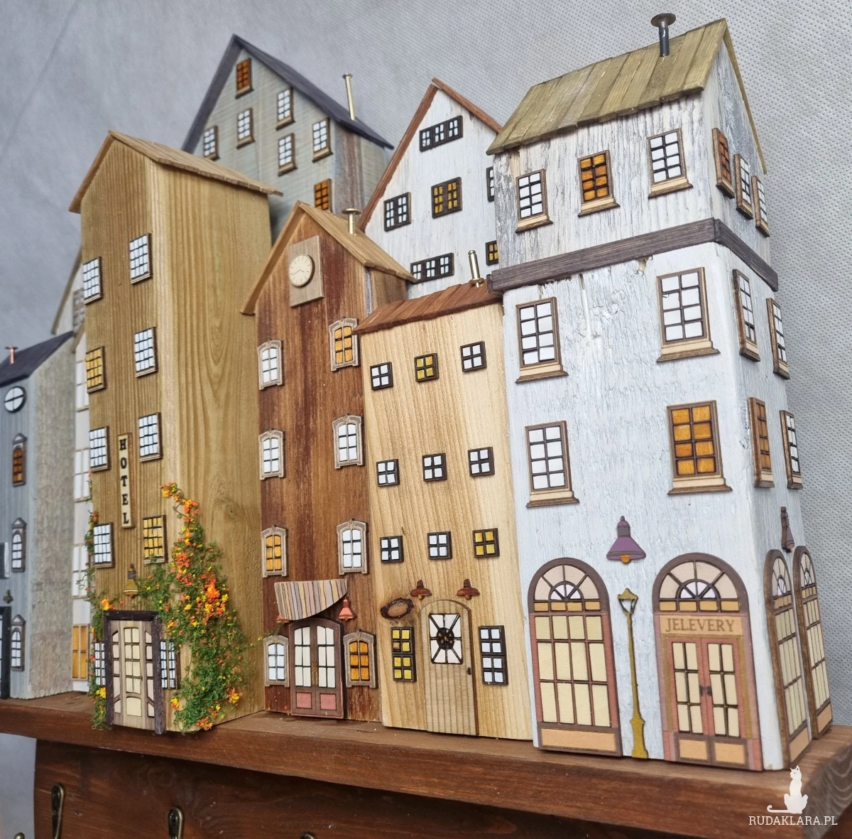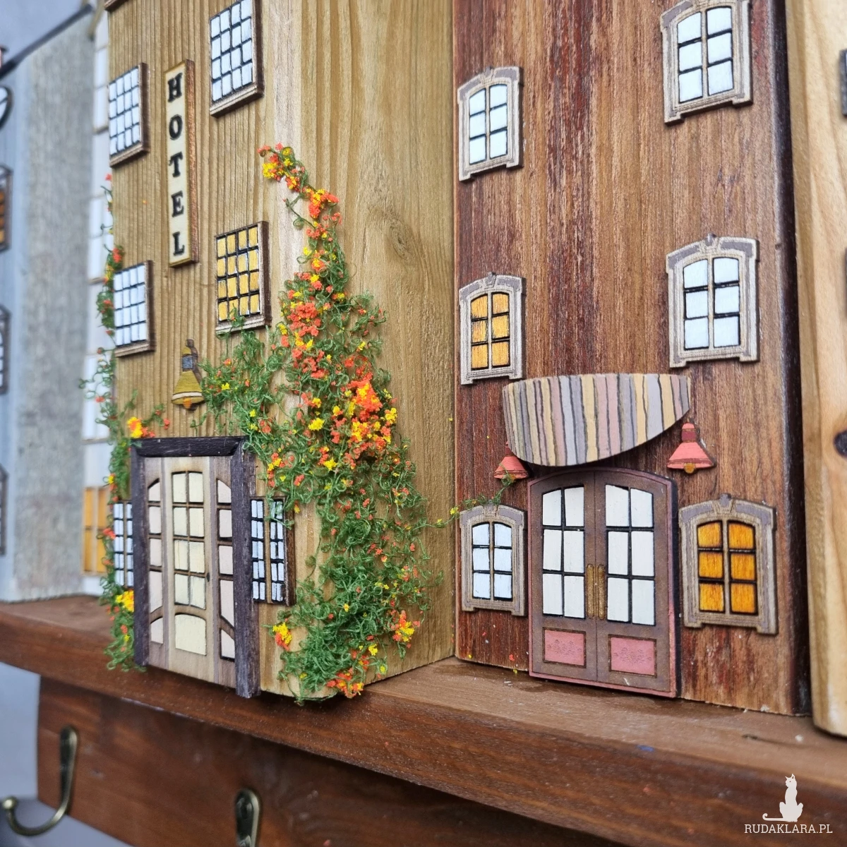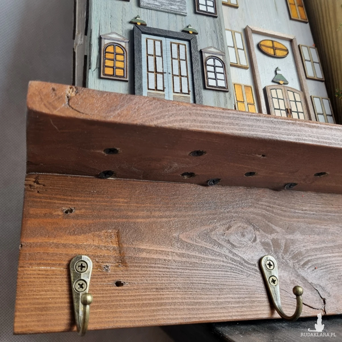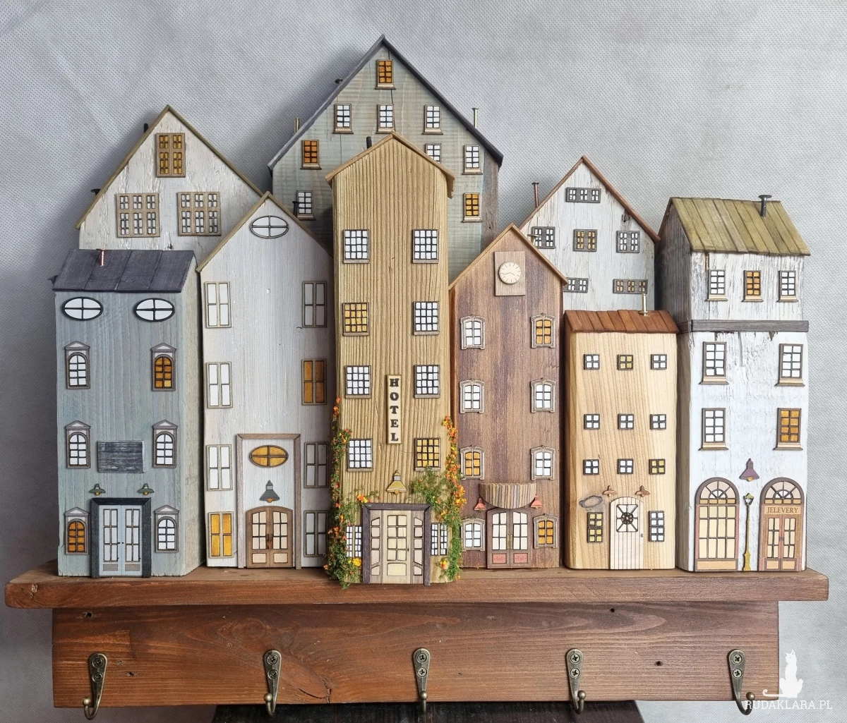 Drewniane domki handmade, mogące służyć jako wieszak na klucze (5), ręczniki inne drobiazgi. Domki wykonane desek ze starych palet z odzysku. Drewno bejcowane, woskowane, malowane w różnych odcieniach - ładnie podkreślające starość drewna - malowane bezbarwną farbą akrylową. Drewniane, wycinane okna i drzwi, również inne detale. Długość 51 cm, wysokość 45 cm, grubość 8 cm . Całość do zawieszenia na ścianie na 2 hakach. (20)