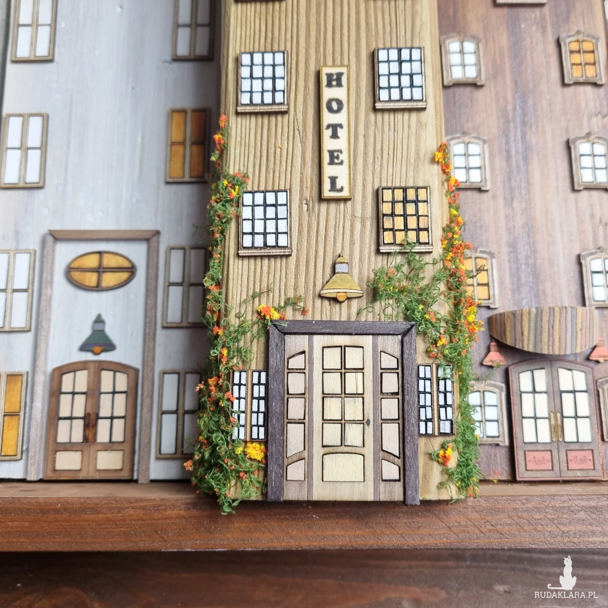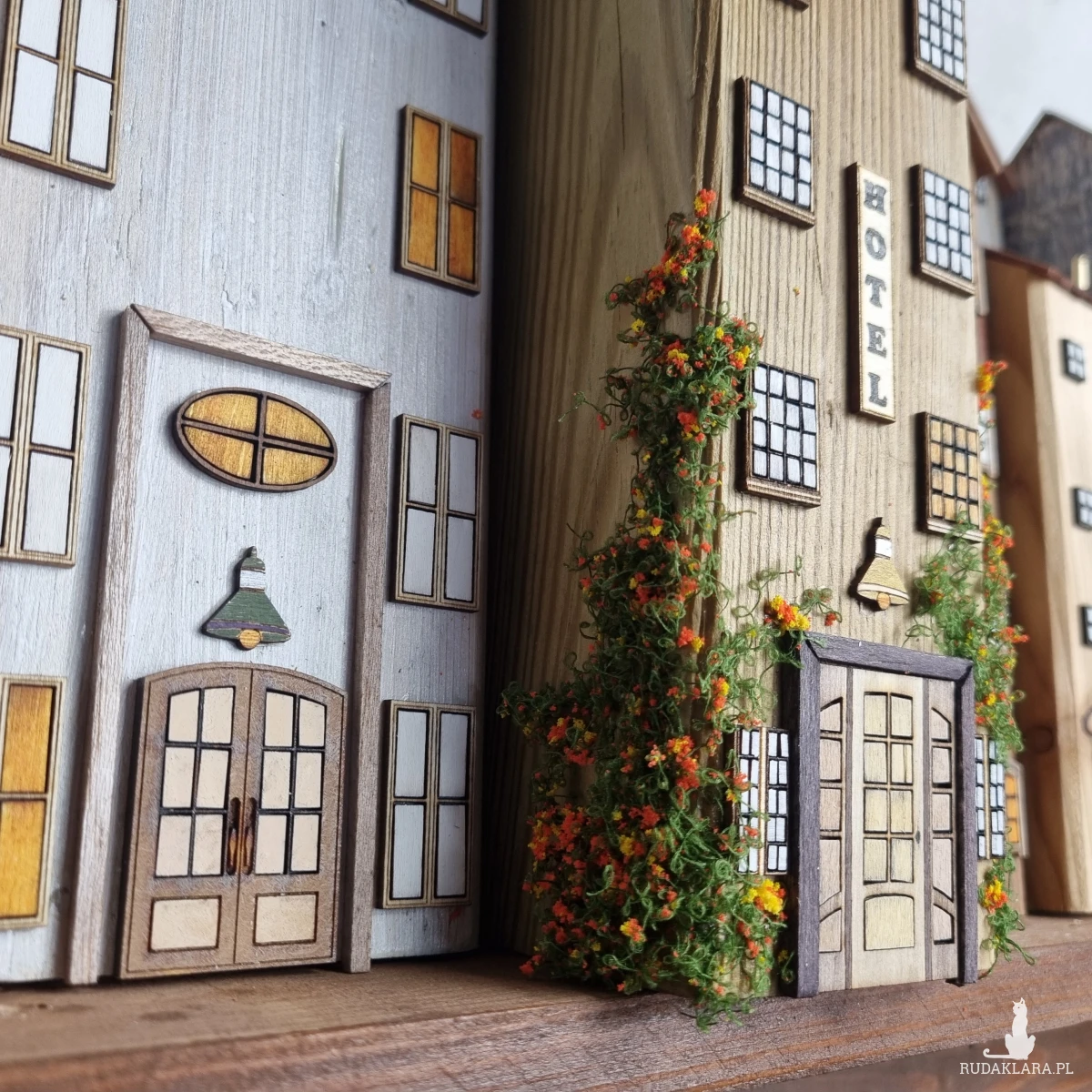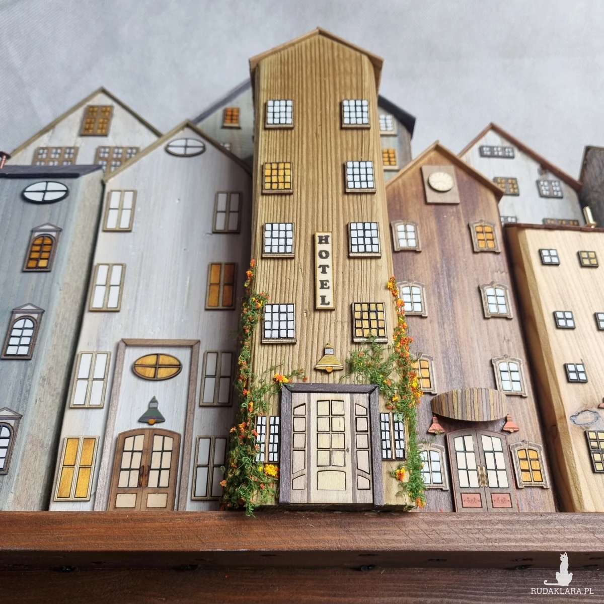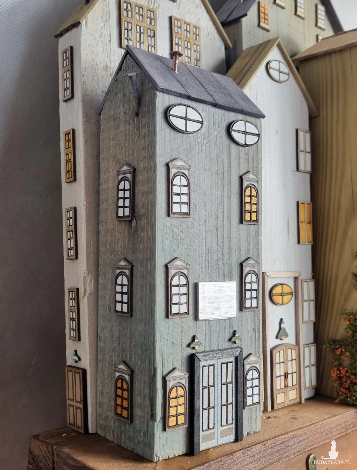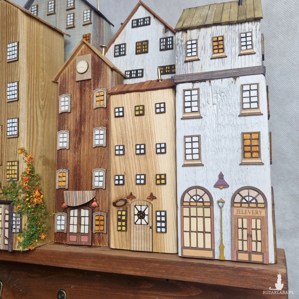 Drewniane domki handmade, mogące służyć jako wieszak na klucze (5), ręczniki inne drobiazgi. Domki wykonane desek ze starych palet z odzysku. Drewno bejcowane, woskowane, malowane w różnych odcieniach - ładnie podkreślające starość drewna - malowane bezbarwną farbą akrylową. Drewniane, wycinane okna i drzwi, również inne detale. Długość 51 cm, wysokość 45 cm, grubość 8 cm . Całość do zawieszenia na ścianie na 2 hakach. (20)
