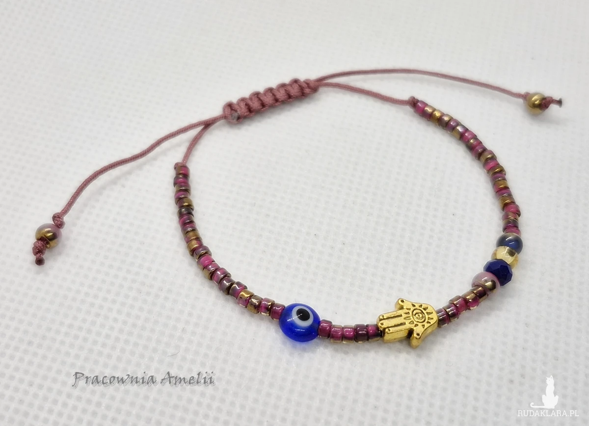 Bransoletka ochronna na sznurku nylonowym w kolorze ciemnego indyjskiego różu (kolor tego sznurka określany jest też jako kolor czerwonej fasoli) z dodatkiem szklanych koralików i metalowej chamsy (stop cynku). Rozmiar uniwersalny.