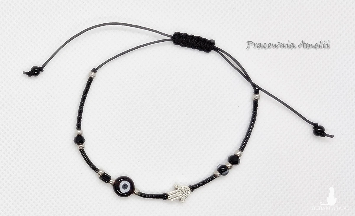 Bransoletka ochronna na czarnym sznurku nylonowym z dodatkiem szklanych koralików (w tym Miyuki i Toho) i metalowej chamsy (stop cynku). Rozmiar uniwersalny. Srebrne galwanizowane koraliki Toho są odporne na ścieranie.