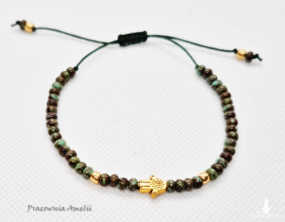 Bransoletka ochronna na ciemnozielonym sznurku nylonowym z dodatkiem szklanych marmurkowych koralików i metalowej chamsy (stop cynku). Rozmiar uniwersalny. Złote galwanizowane koraliki Miyuki są odporne na ścieranie.