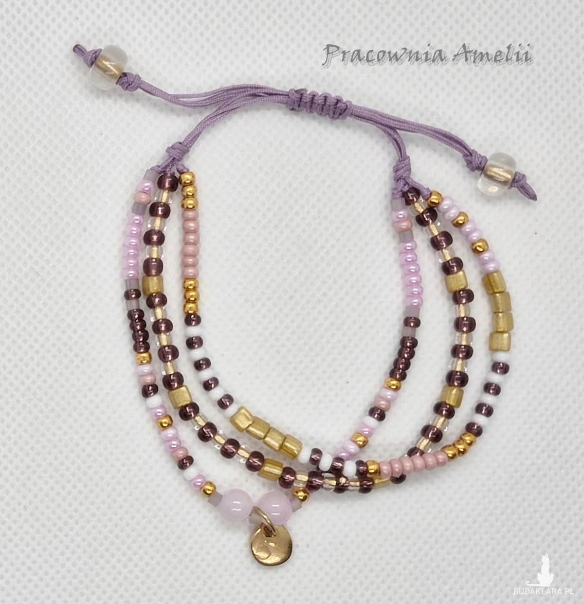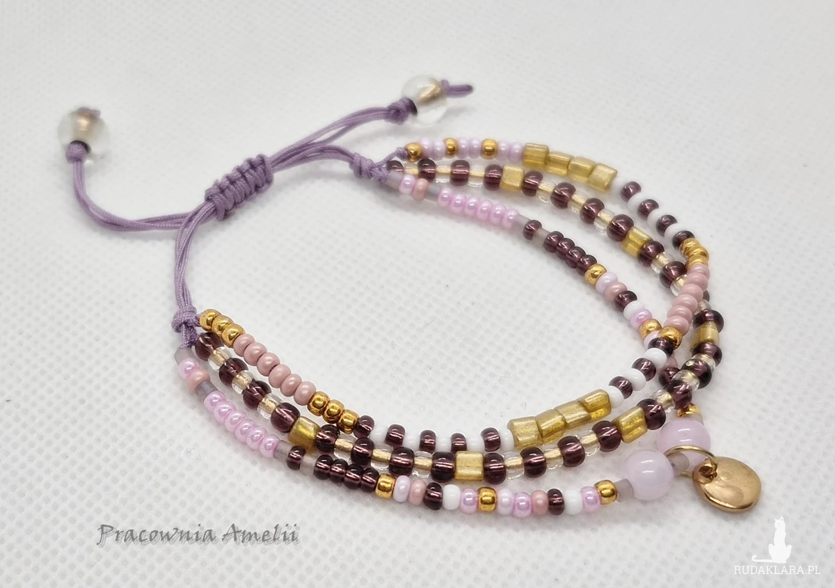Potrójna bransoletka na lawendowym sznurku nylonowym z dodatkiem szklanych koralików i metalowej zawieszki. Rozmiar uniwersalny. Złote galwanizowane koraliki Toho są odporne na ścieranie.