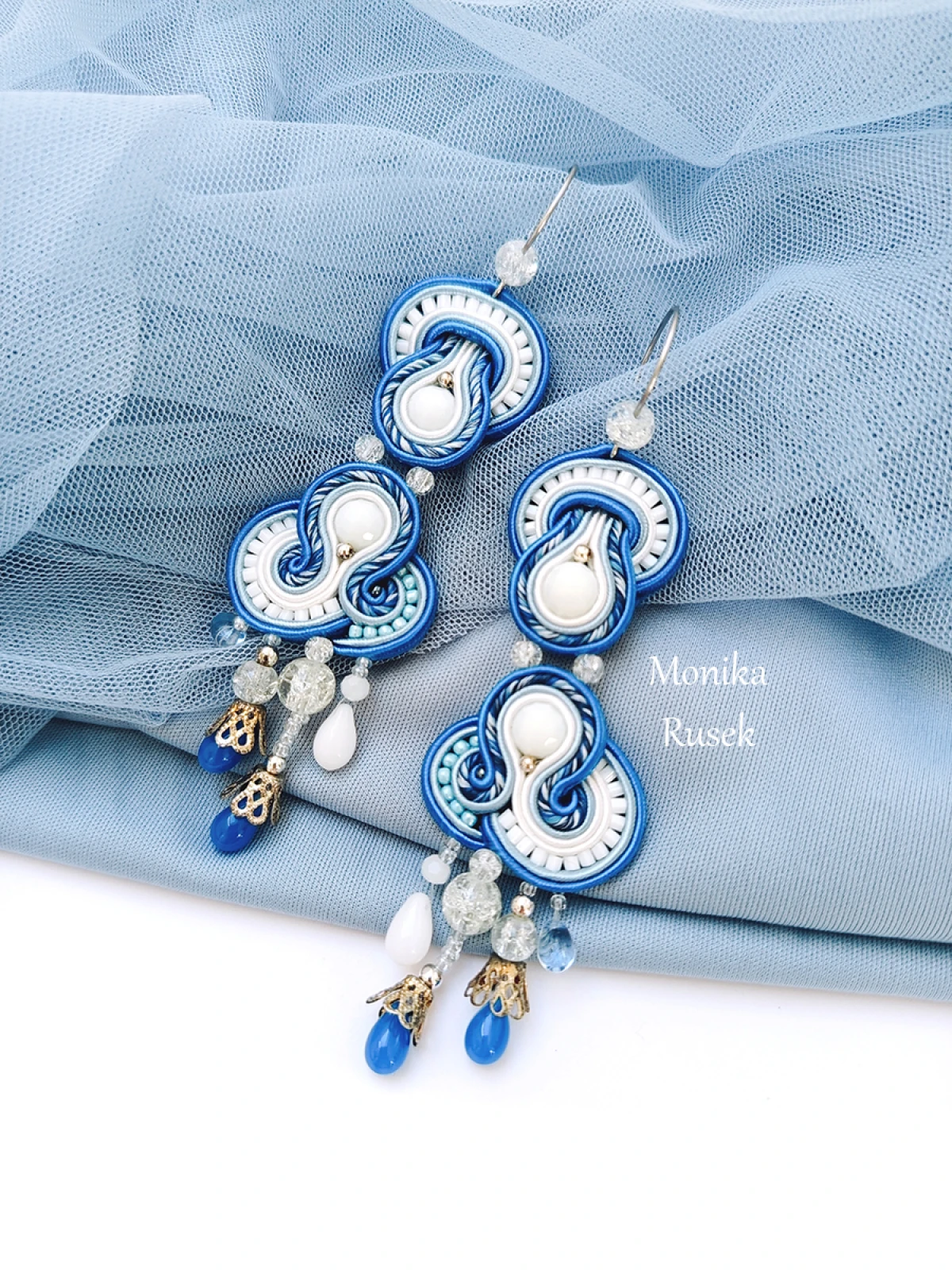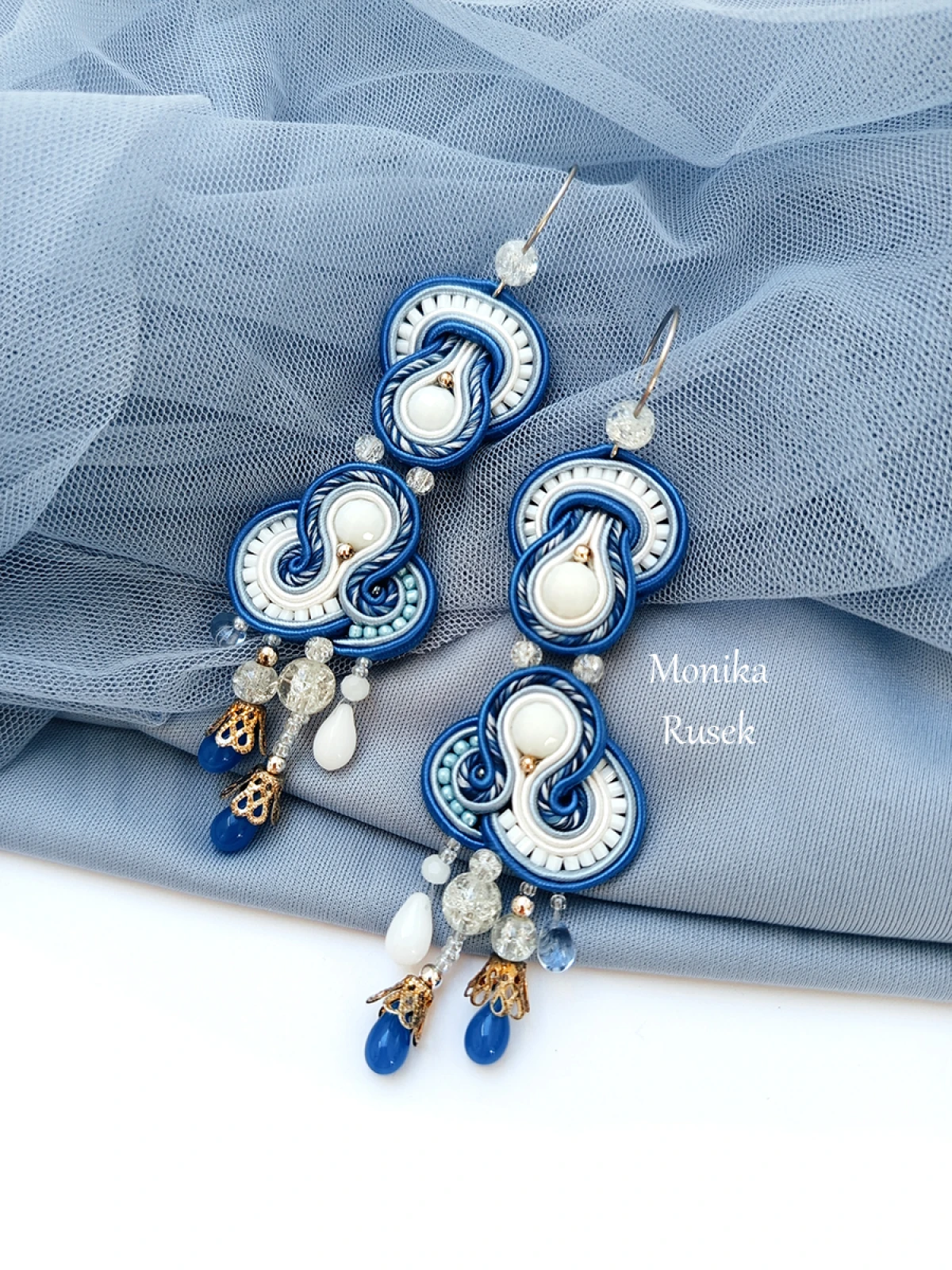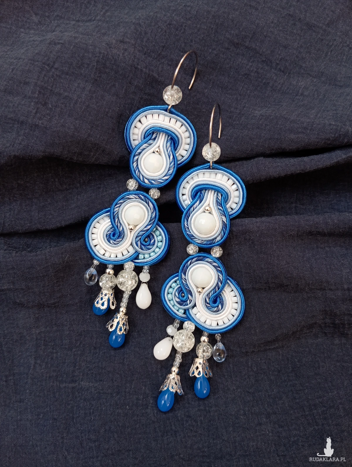 Wykonane z białych i niebieskich sznureczków sutasz, dużej ilości drobnych koralików szklanych, białych kryształków w centrum oraz maleńkich hematytów. Zawieszone na biglach ze stali chirurgicznej. Tył starannie wykończony filcem, dopasowanym kolorystycznie. Impregnowane, co w znacznym stopniu zapobiega zabrudzeniom.