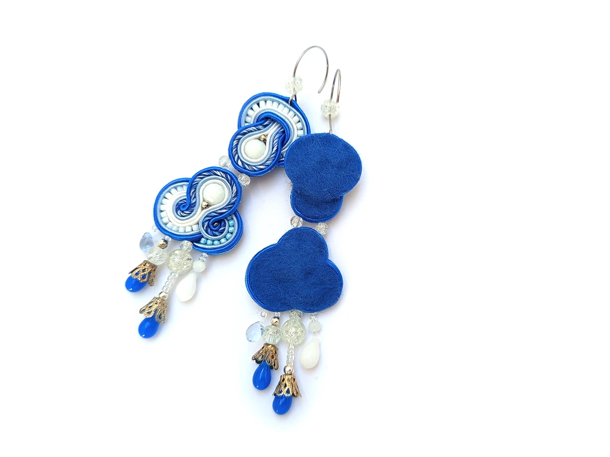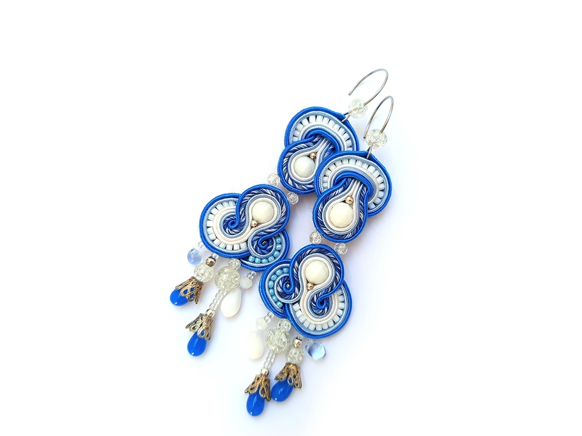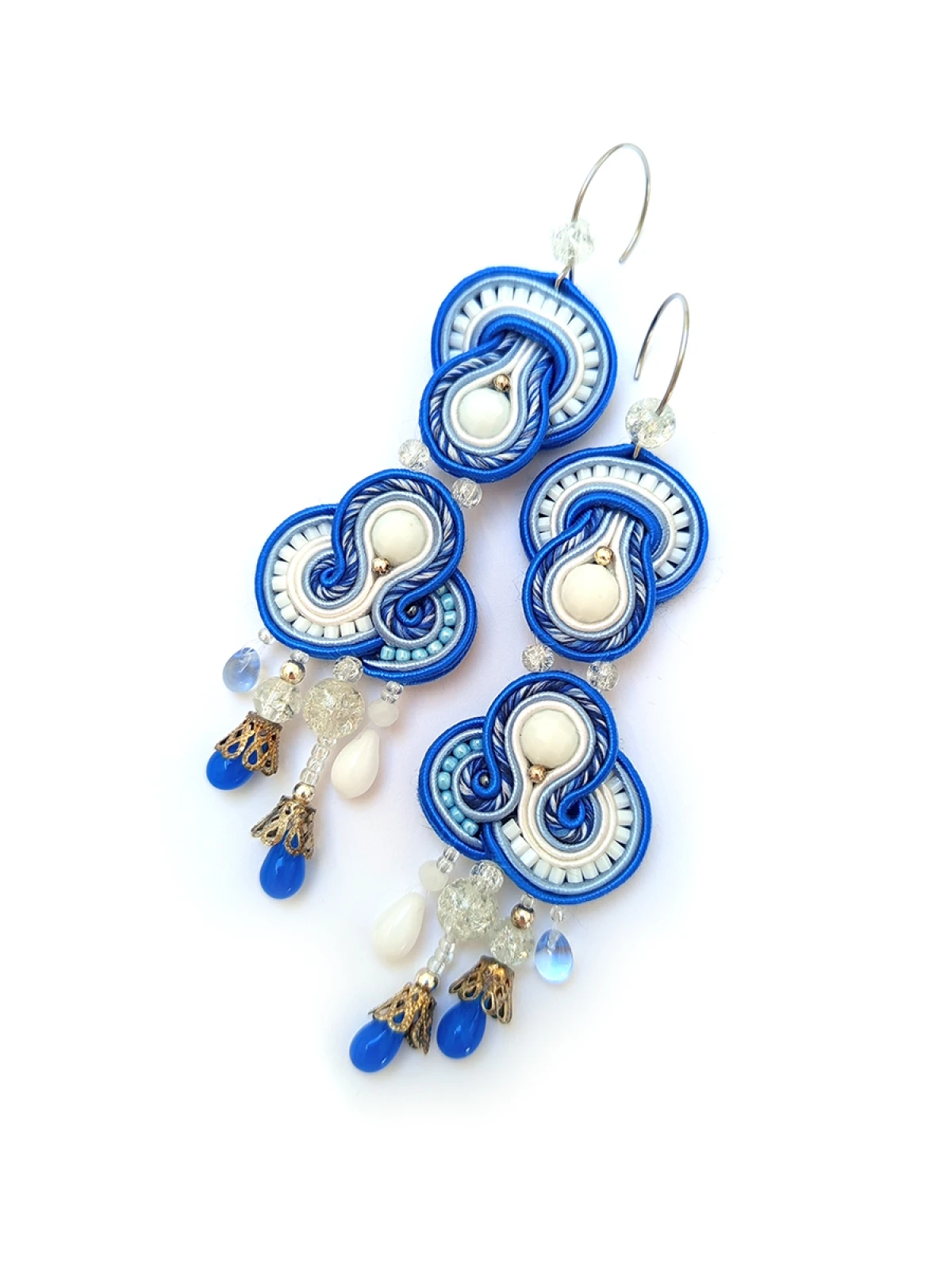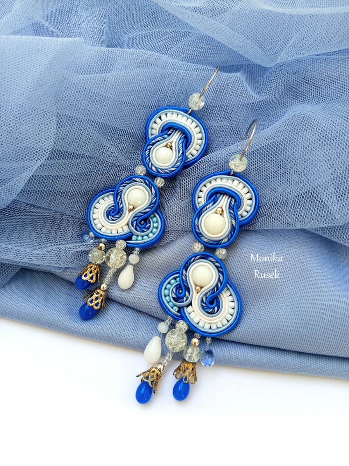 Wykonane z białych i niebieskich sznureczków sutasz, dużej ilości drobnych koralików szklanych, białych kryształków w centrum oraz maleńkich hematytów. Zawieszone na biglach ze stali chirurgicznej. Tył starannie wykończony filcem, dopasowanym kolorystycznie. Impregnowane, co w znacznym stopniu zapobiega zabrudzeniom.