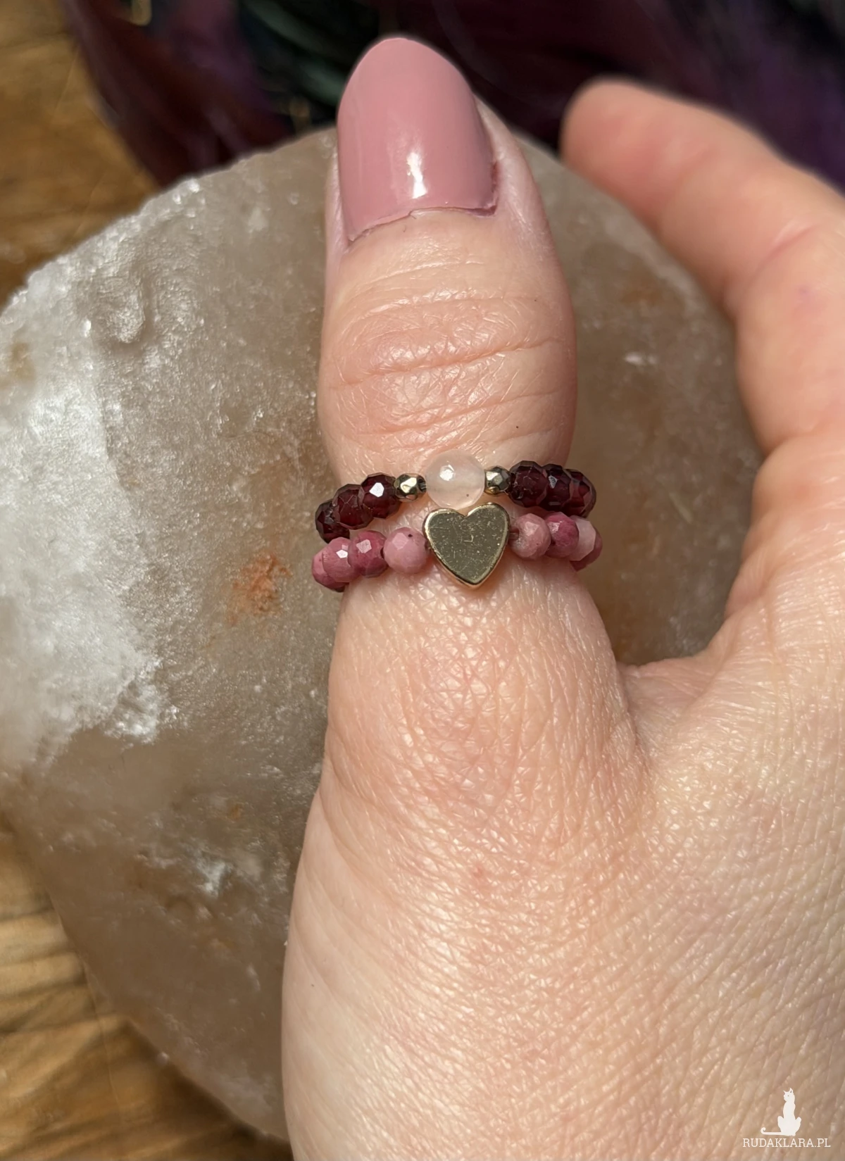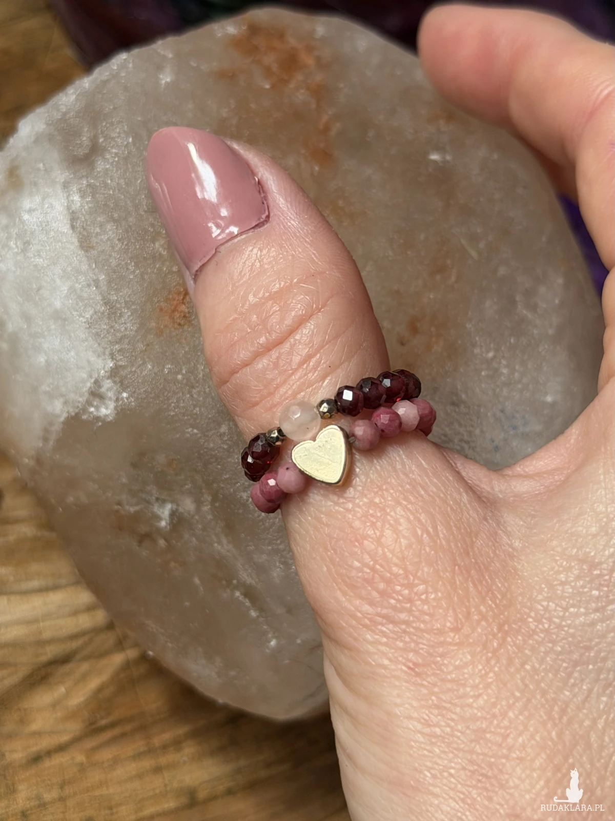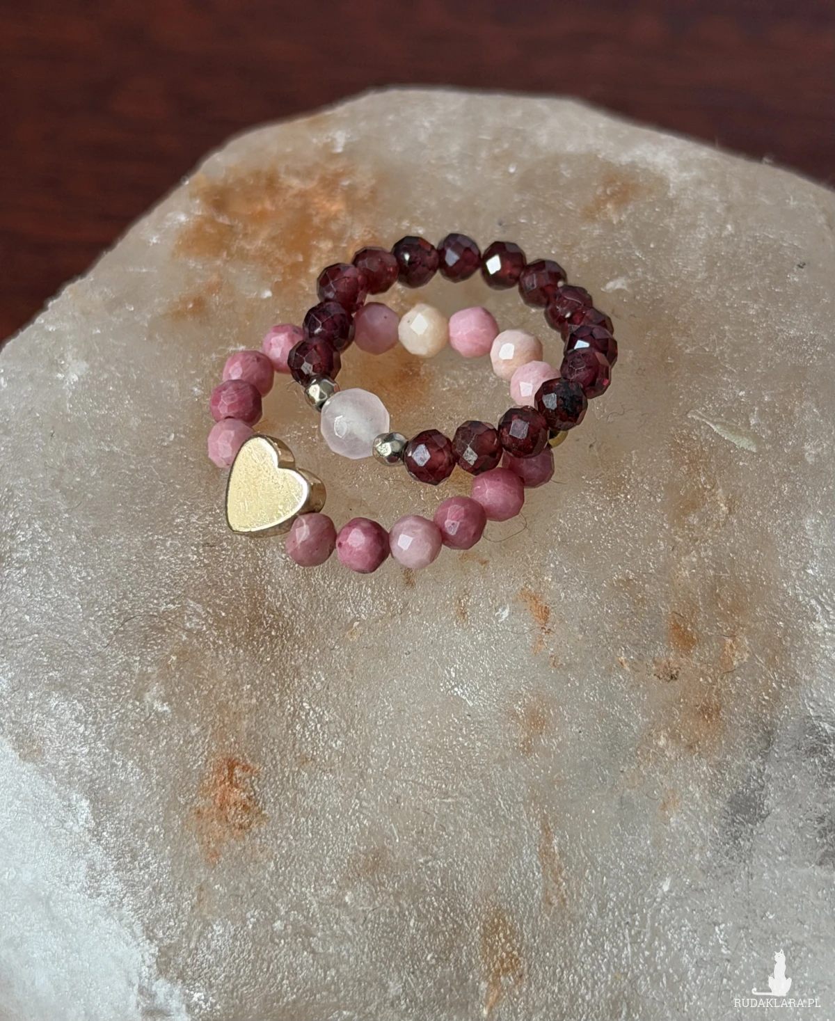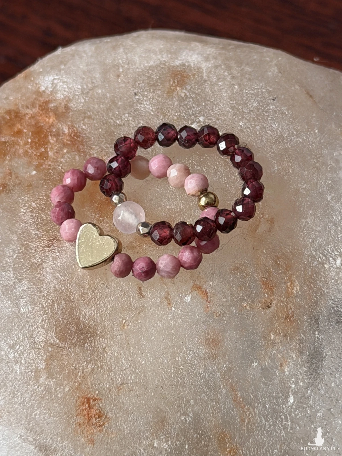 Zestaw dwóch pierścionków elastycznych na gumce. Kamienie naturalne: granat, kwarc różowy, rodochrozyt.