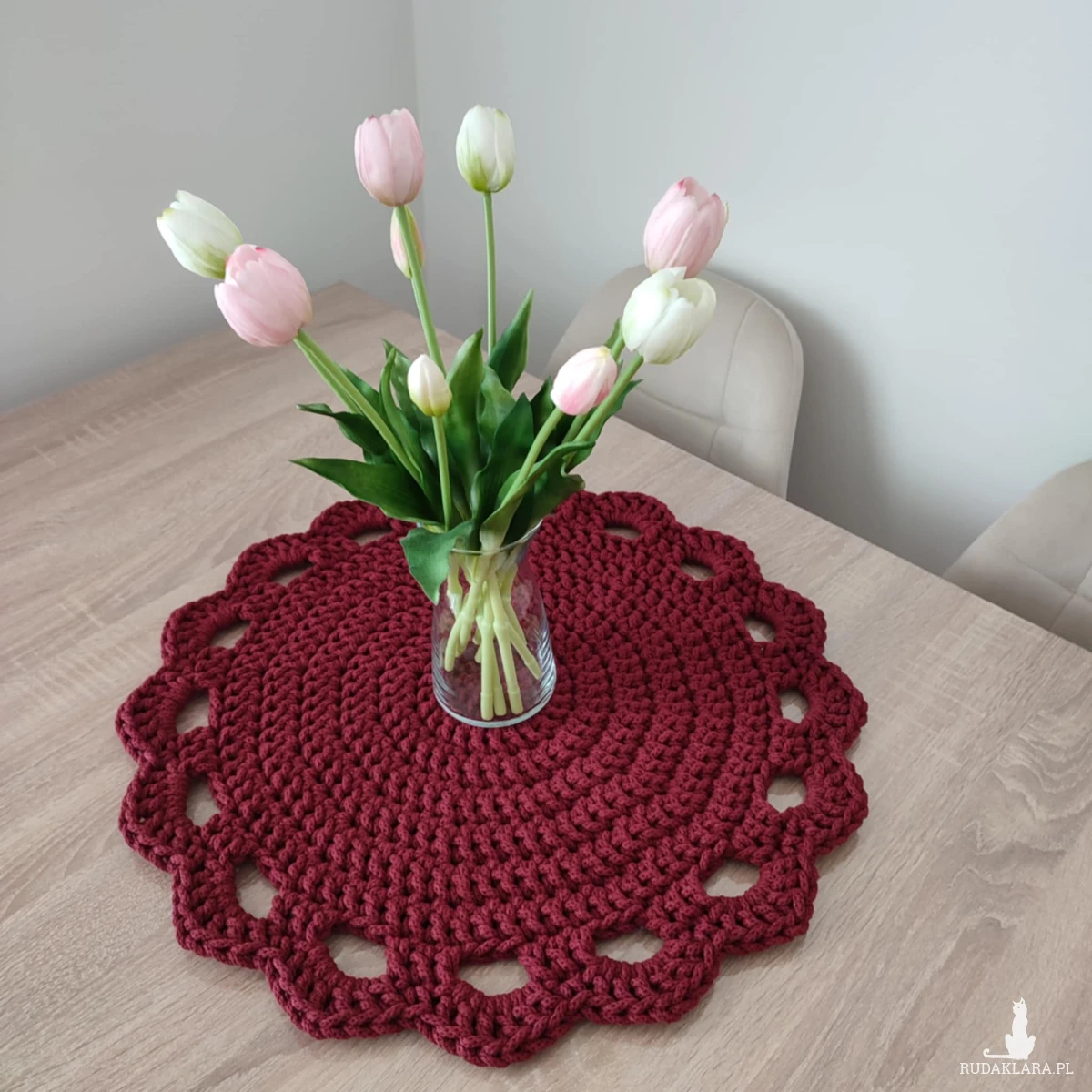 Podkładka o średnicy 50cm, wykonana metodą szydełkowania z polskiego sznurka bawełnianego 5mm.