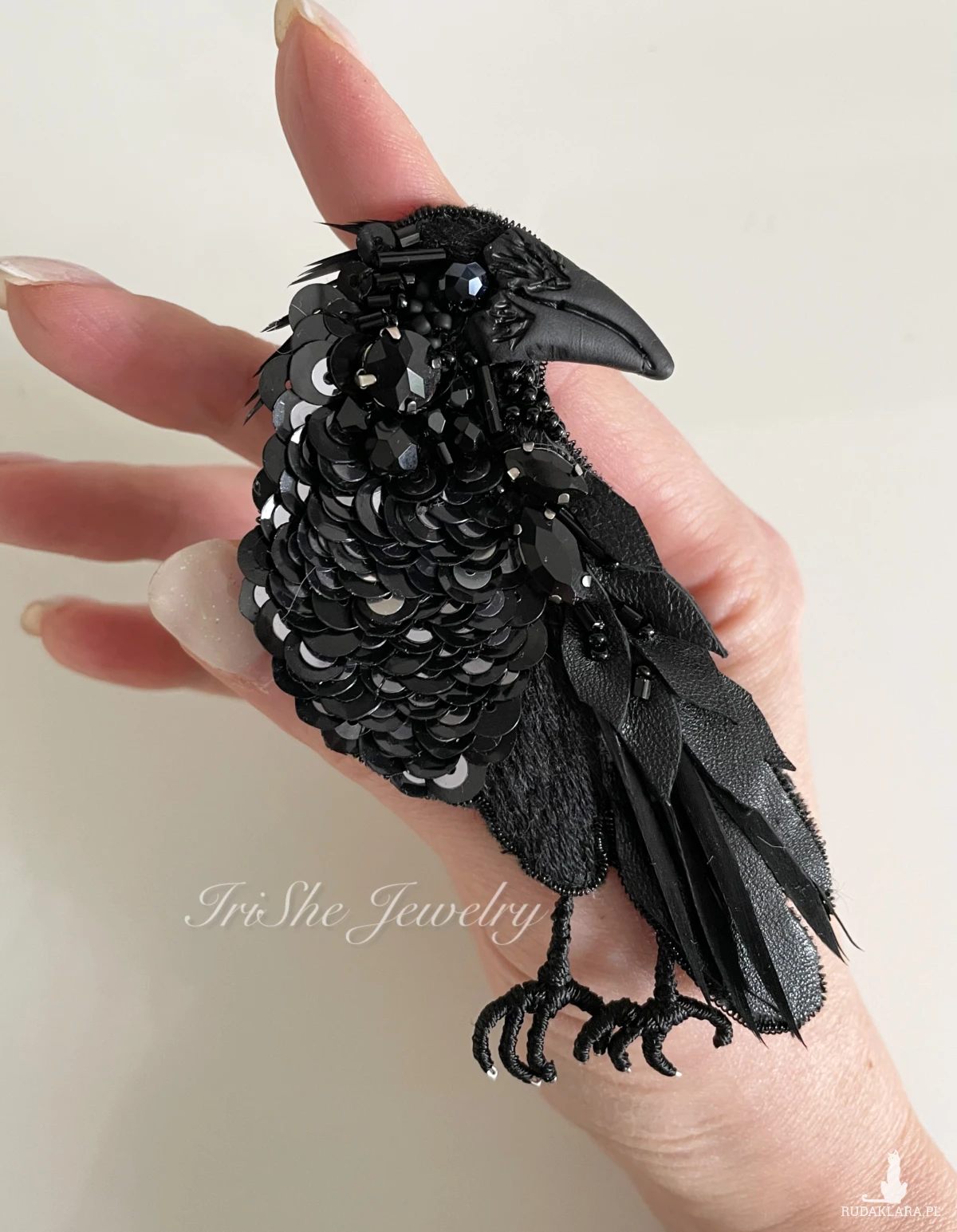 Materiały: Broszka została stworzona w technice mieszanej haftu z wykorzystaniem czarnej włoskiej skóry naturalnej, wysokiej jakości koralików i kryształów oraz modeliny Fimo. Kompozycję dopełniają naturalne gęsie pióra, które nadają pracy lekkości i przestrzennej formy, podkreślając głębię czerni.