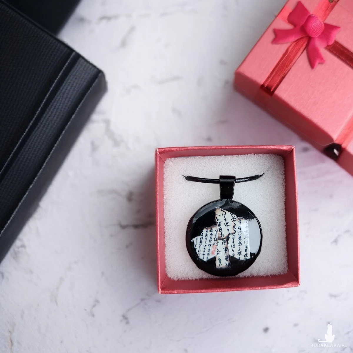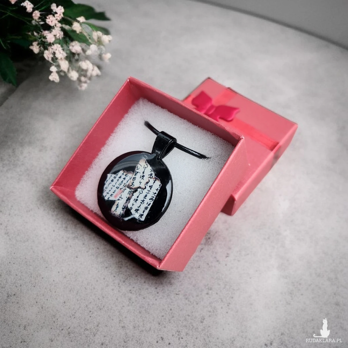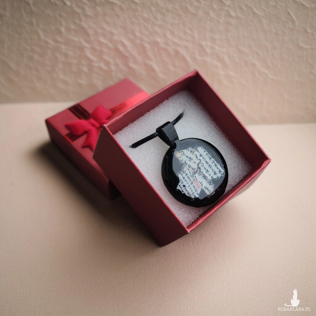 Wyjątkowy naszyjnik wykonany ręcznie z wysokiej jakości żywicy epoksydowej. Wewnątrz wisiora znajduje się artystyczna kompozycja z fragmentami papieru z kaligrafią, tworząca niepowtarzalny, głęboki efekt. Każdy egzemplarz jest jedyny w swoim rodzaju – nie ma dwóch identycznych naszyjników.