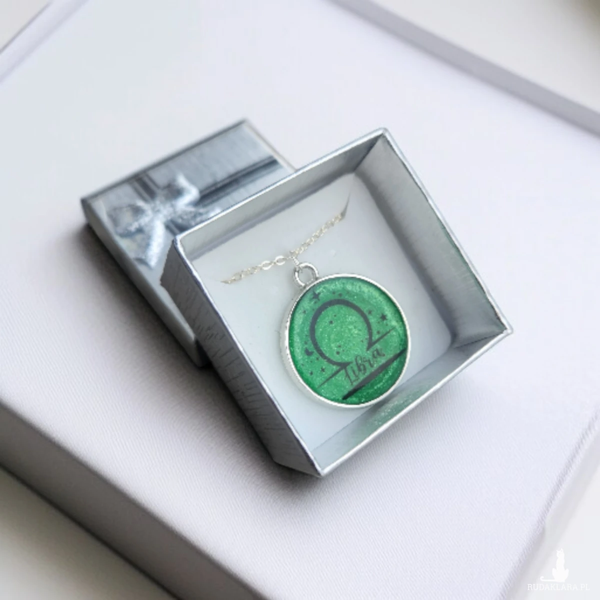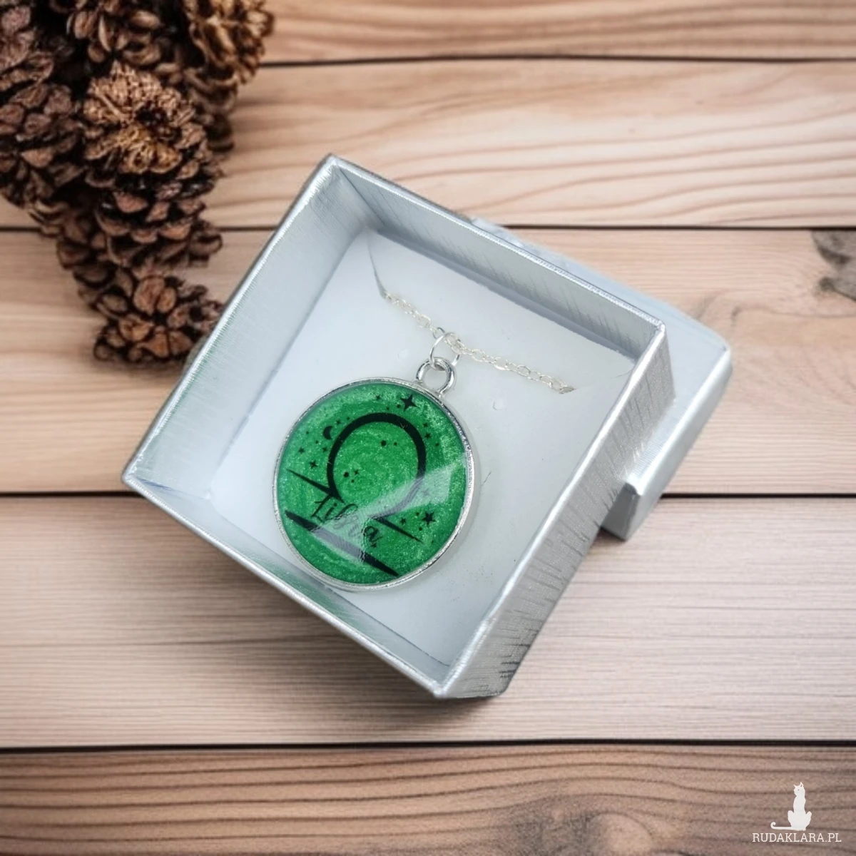 Przepiękny, ręcznie wykonany naszyjnik z motywem znaku zodiaku Waga to idealny prezent dla osób urodzonych między 23 września a 22 października. Medalion w odcieniach intensywnej zieleni z delikatnym brokatowym połyskiem został ozdobiony symbolem Wagi oraz subtelnymi akcentami gwiazd, tworząc wyjątkowy, kosmiczny charakter.