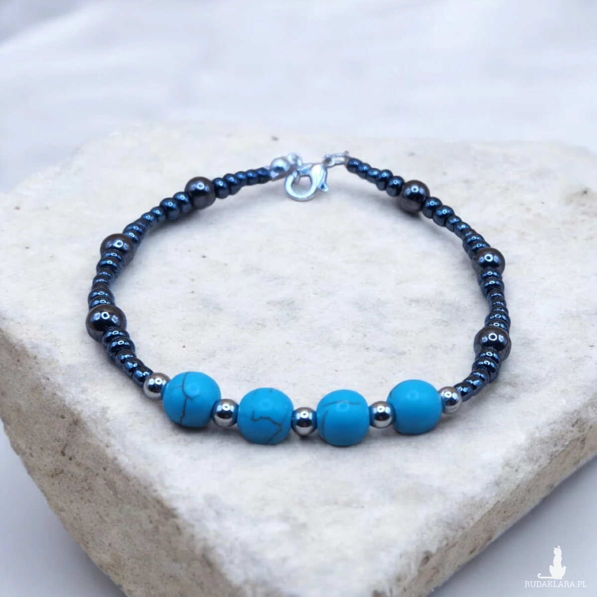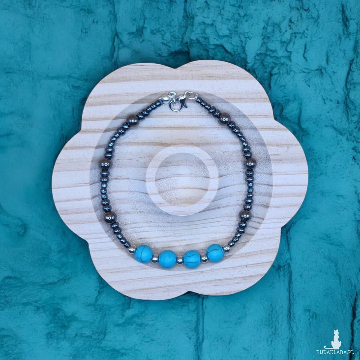 Stylowa, ręcznie wykonana bransoletka o nowoczesnym charakterze. Połączenie intensywnego turkusu z połyskującymi, grafitowymi koralikami nadaje jej elegancki i uniwersalny wygląd. Subtelny design sprawia, że bransoletka doskonale uzupełni zarówno codzienne stylizacje, jak i bardziej elegancki strój.