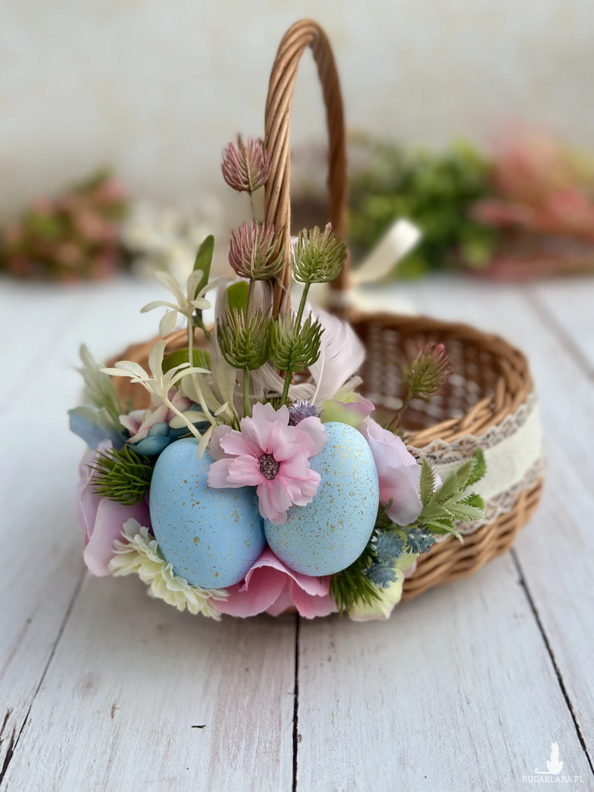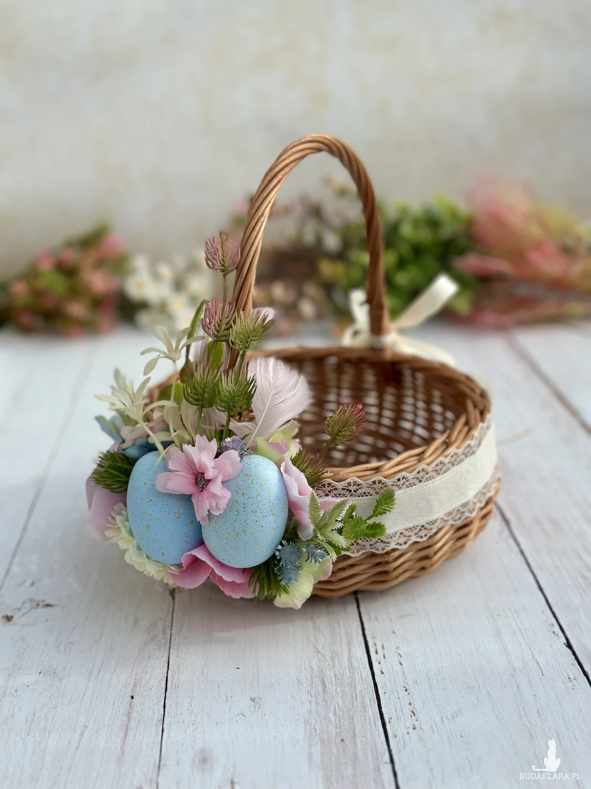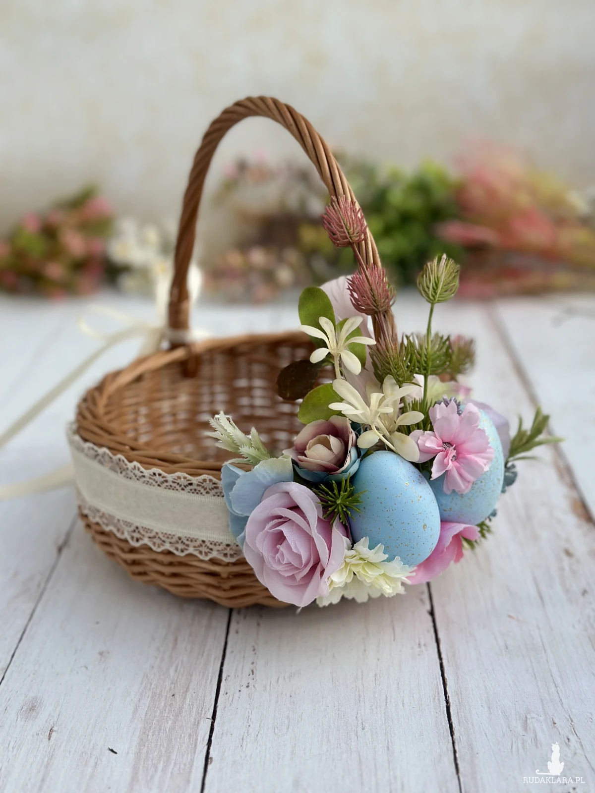 Koszyczek wielkanocny z naturalnej wikliny, ozdobiony kwiatami i dodatkami sztucznymi. Dekoracja na stałe przymocowana do koszyczka, przygotowana przeze mnie ręcznie :)