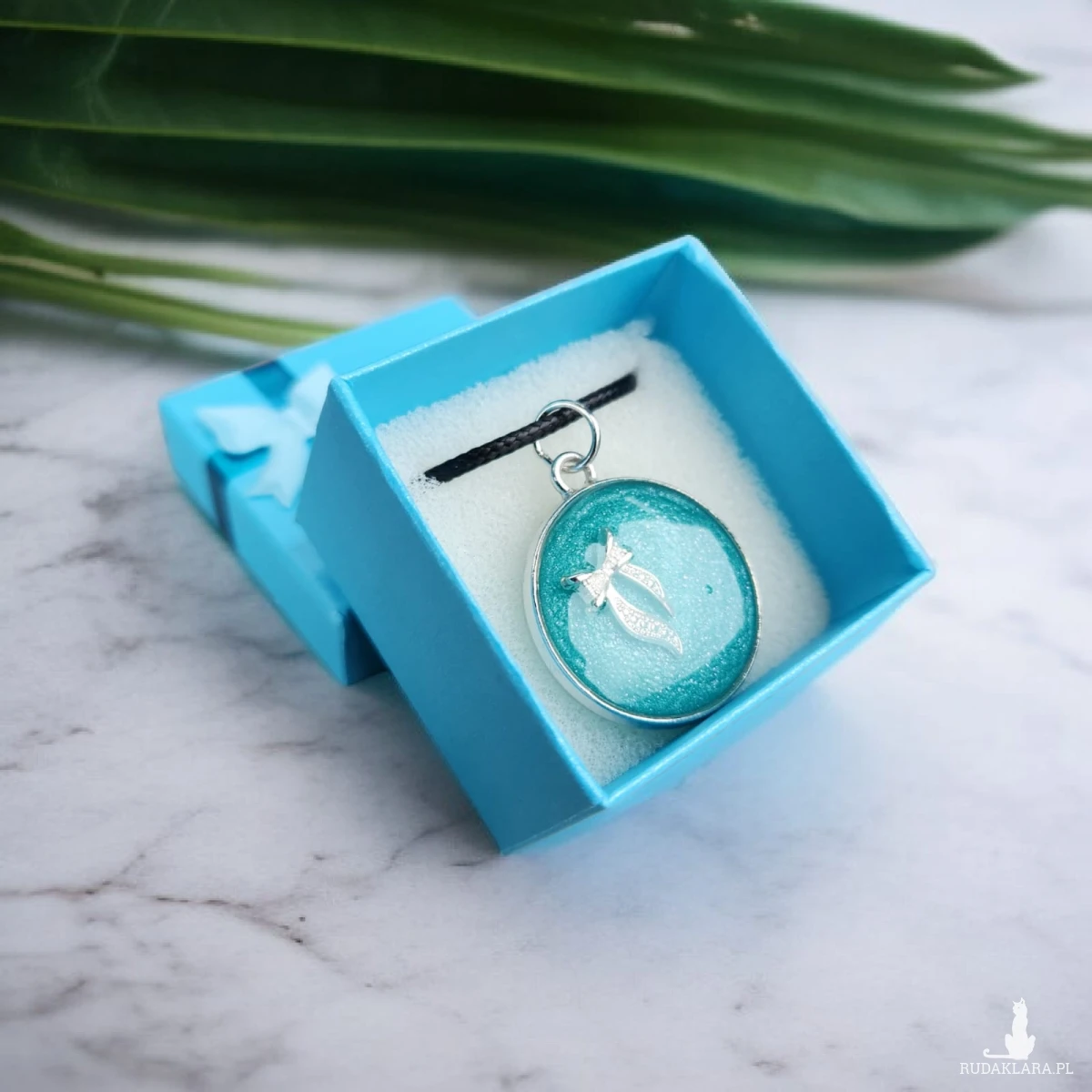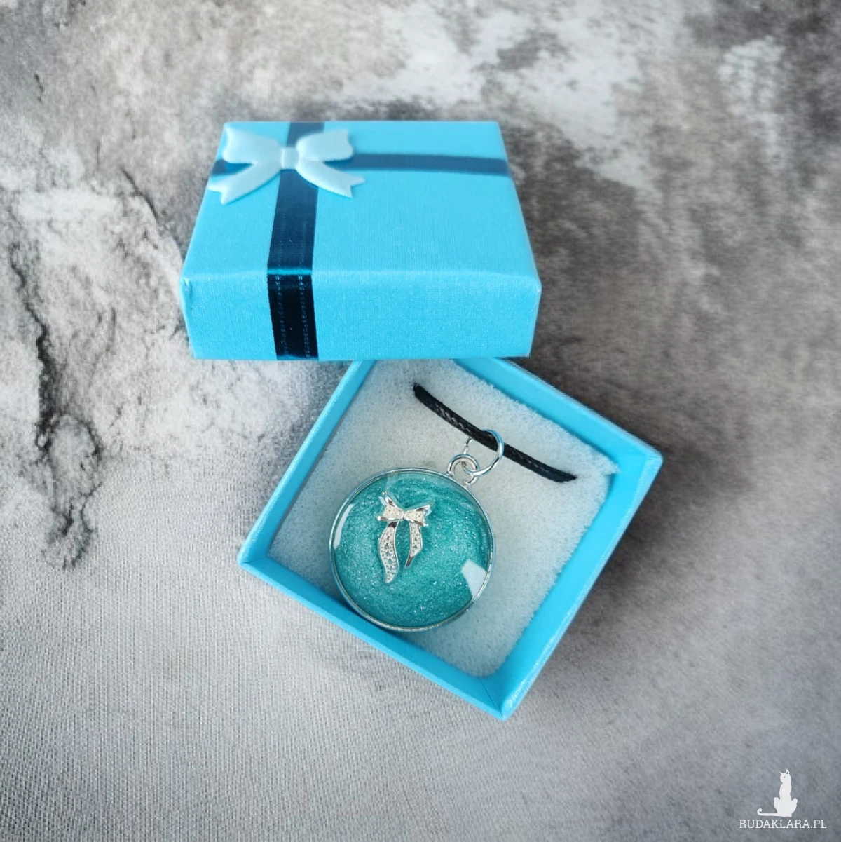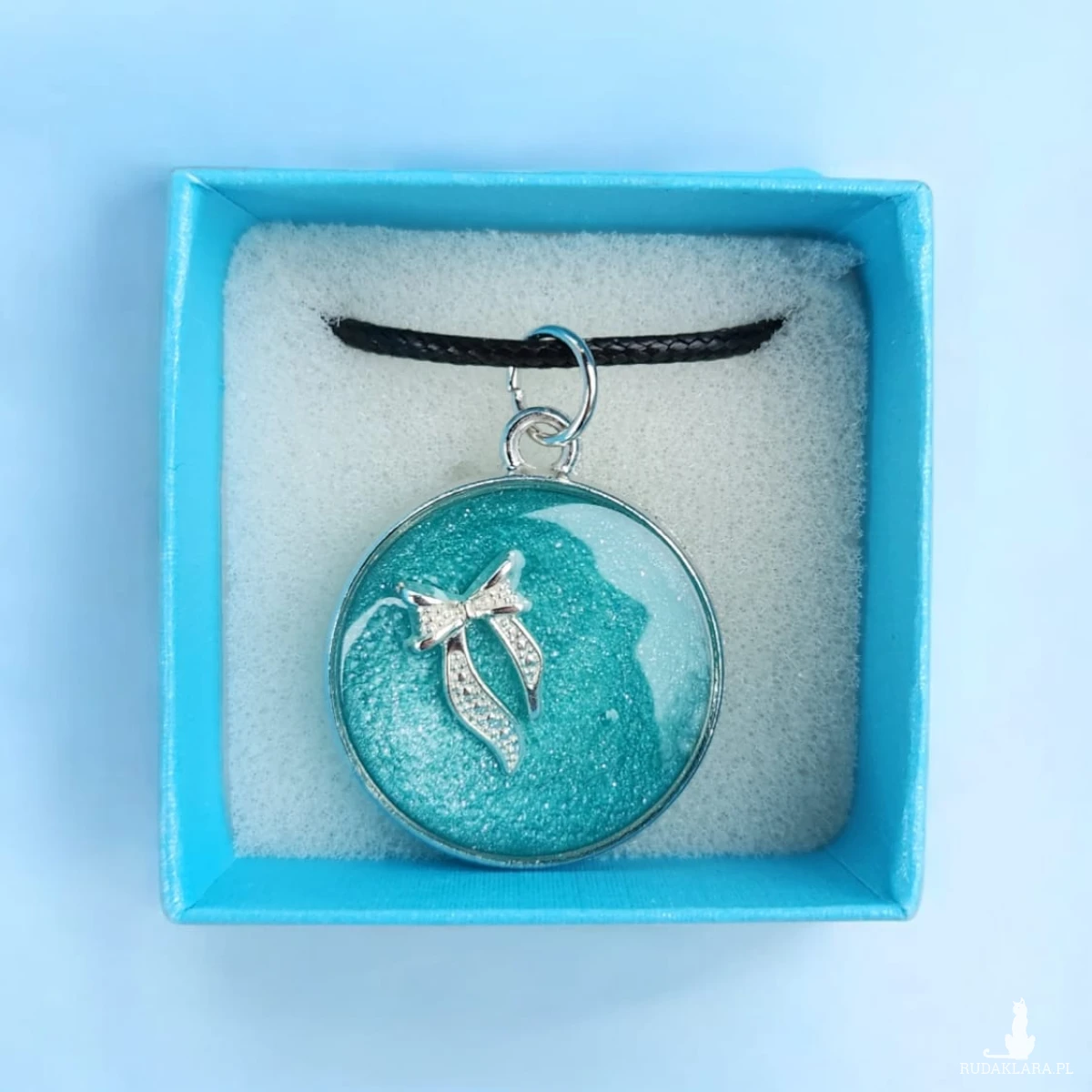 Wyjątkowy, ręcznie wykonany naszyjnik z żywicy epoksydowej, który zachwyca subtelnym blaskiem i elegancją. Okrągły medalion w odcieniu turkusu z delikatnym, mieniącym się efektem został ozdobiony srebrną kokardą, symbolizującą lekkość, wdzięk i kobiecość.
