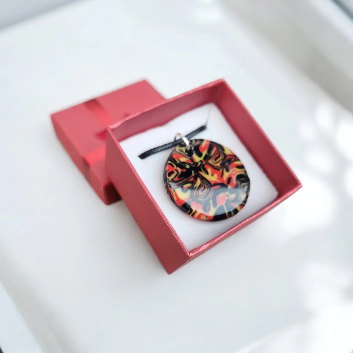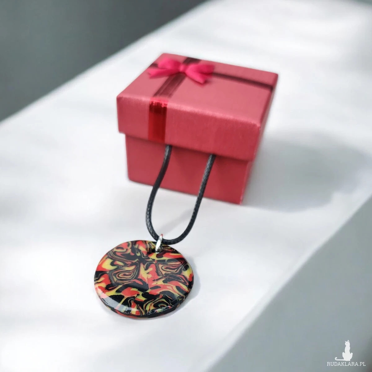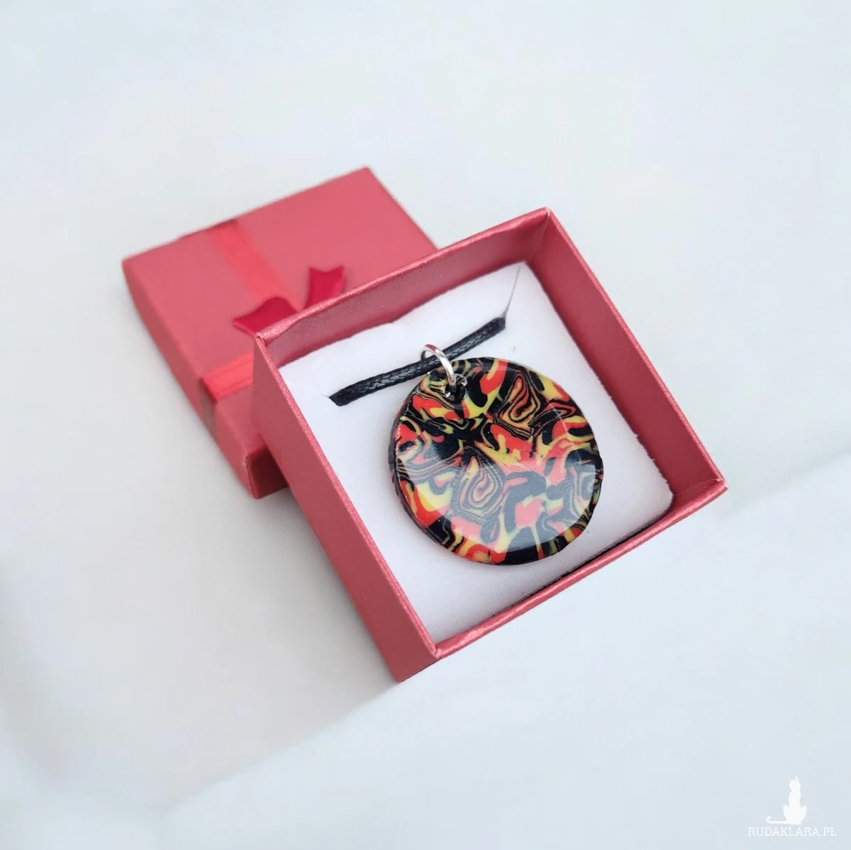 Sprzedam wyjątkowy, ręcznie wykonany naszyjnik z gliny polimerowej i żywicy. Okrągły wisior posiada abstrakcyjny wzór w intensywnych kolorach: czerwieni, żółci i czerni. Każdy egzemplarz jest jedyny w swoim rodzaju – dokładnie ten ze zdjęcia.
