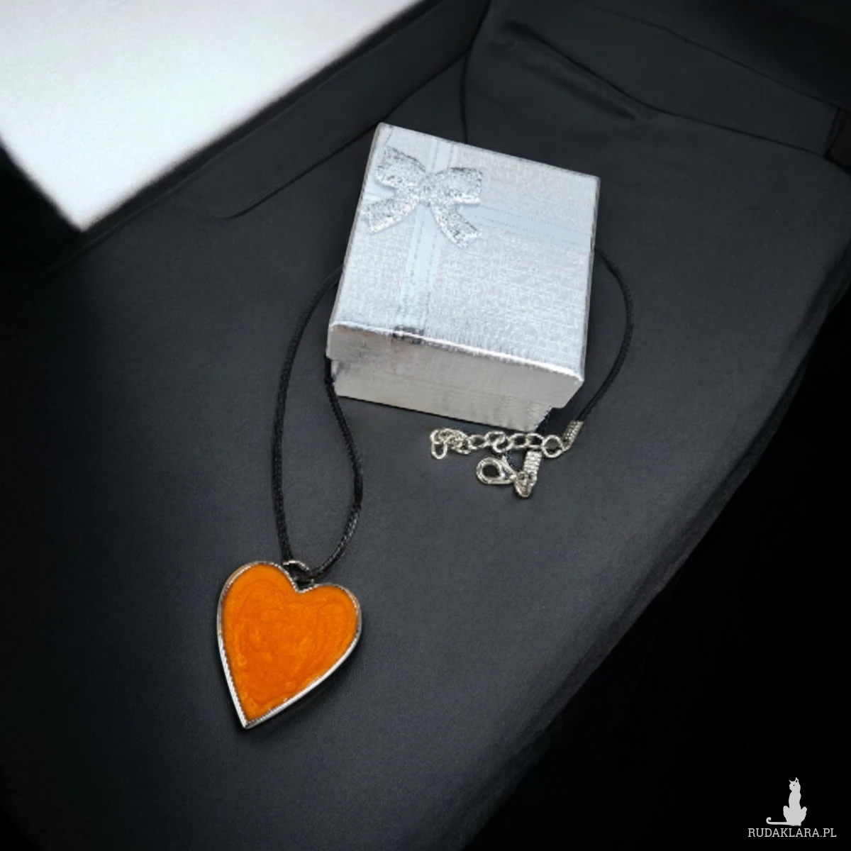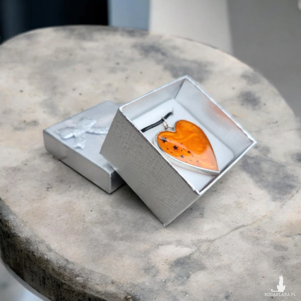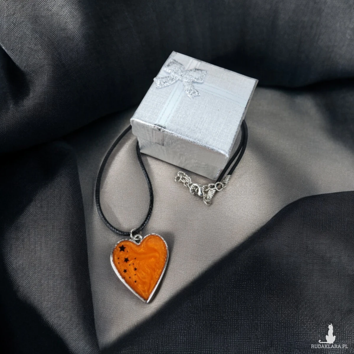 Wnieś odrobinę magii do swojej codzienności dzięki temu wyjątkowemu naszyjnikowi w kształcie serca. Wypełniony intensywną, pomarańczową żywicą o perłowym połysku i ozdobiony czarnymi gwiazdkami, tworzy niepowtarzalny efekt miniaturowej galaktyki zamkniętej w biżuterii.