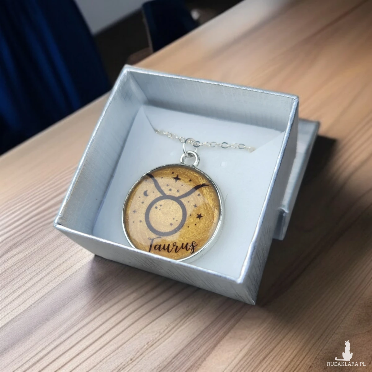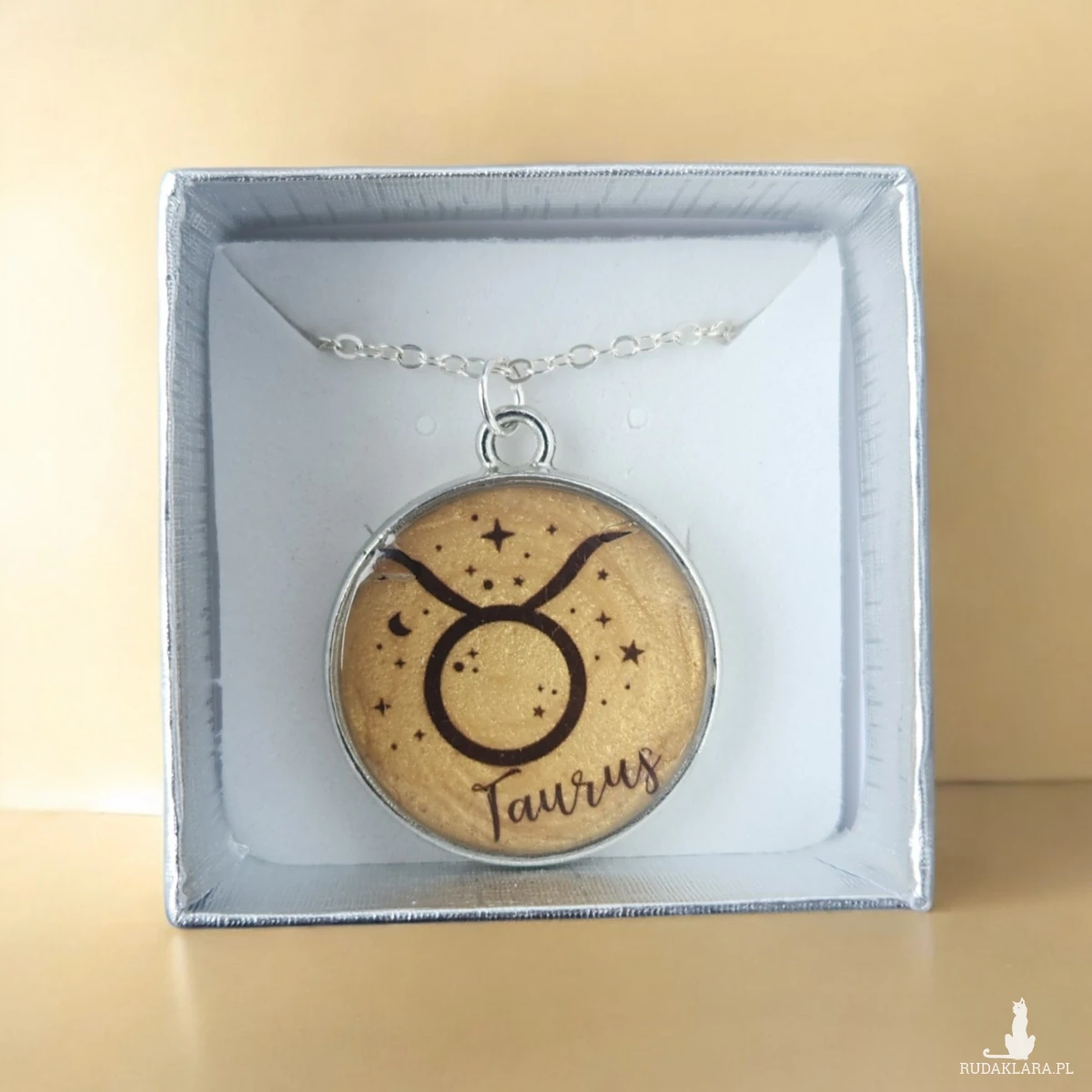 Ten wyjątkowy wisiorek został ręcznie wykonany z wysokiej jakości żywicy, tworząc trwałą i piękną formę, która zachwyca ciepłym, złocistym tłem. W jego centrum znajduje się symbol zodiaku Taurus (Byk), otoczony delikatnymi gwiazdkami i księżycem, co nadaje całości subtelnego, astrologicznego charakteru. Każdy egzemplarz jest odlewany indywidualnie, dlatego układ barw i drobnych detali może się nieznacznie różnić, czyniąc biżuterię absolutnie niepowtarzalną.