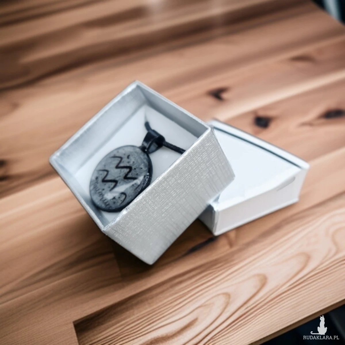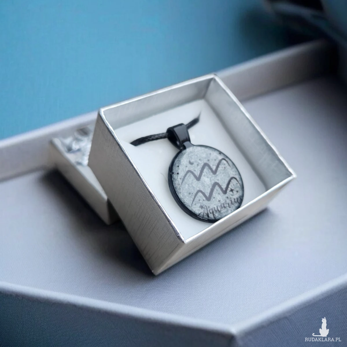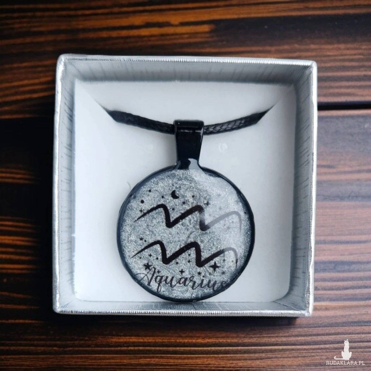 Odkryj wyjątkowy naszyjnik z żywicy inspirowany znakiem zodiaku Wodnik. Wisiorek został wykonany ręcznie z dbałością o każdy detal – w jego środku znajduje się srebrzyste, delikatnie połyskujące tło przypominające kosmiczny pył, na którym widnieje minimalistyczny symbol Wodnika oraz drobne akcenty gwiazd. Całość zamknięta jest w eleganckiej czarnej oprawie, nadającej mu nowoczesny i lekko mistyczny charakter.