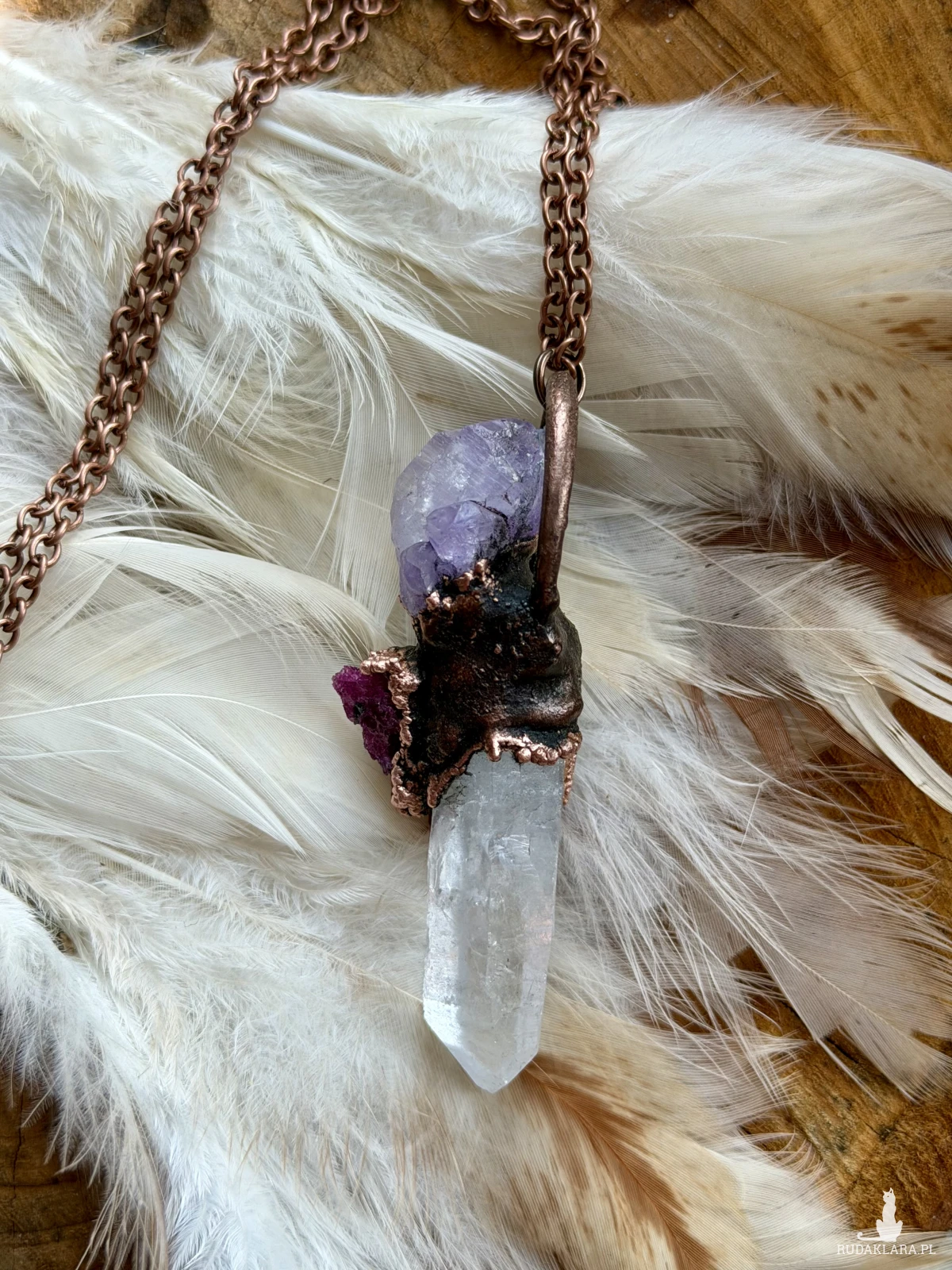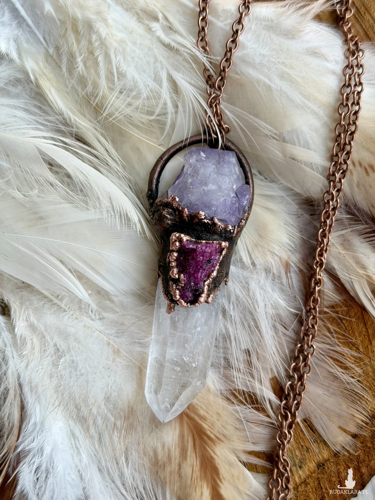 Miedziany naszyjnik z rubinem, ametystem i kryształem górskim. wys.7,2cm; szer.2,6cm łańcuszek 60cm