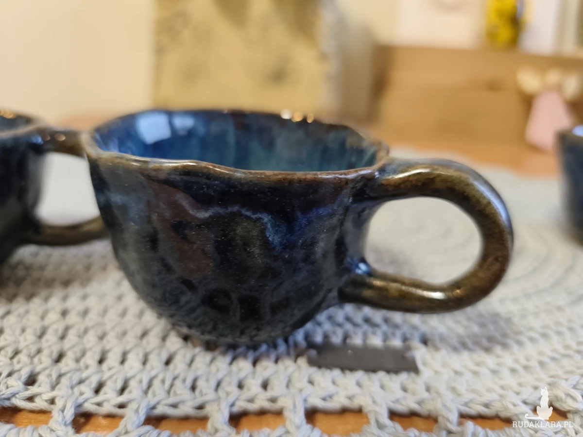 Kubek ceramiczny, na kawkę lub herbatkę, wykonany ręcznie, szkliwiony szkliwem dostosowanym do przeznaczenia. Pojemność około 100ml. Cena za sztukę, posiadam 3 szt.