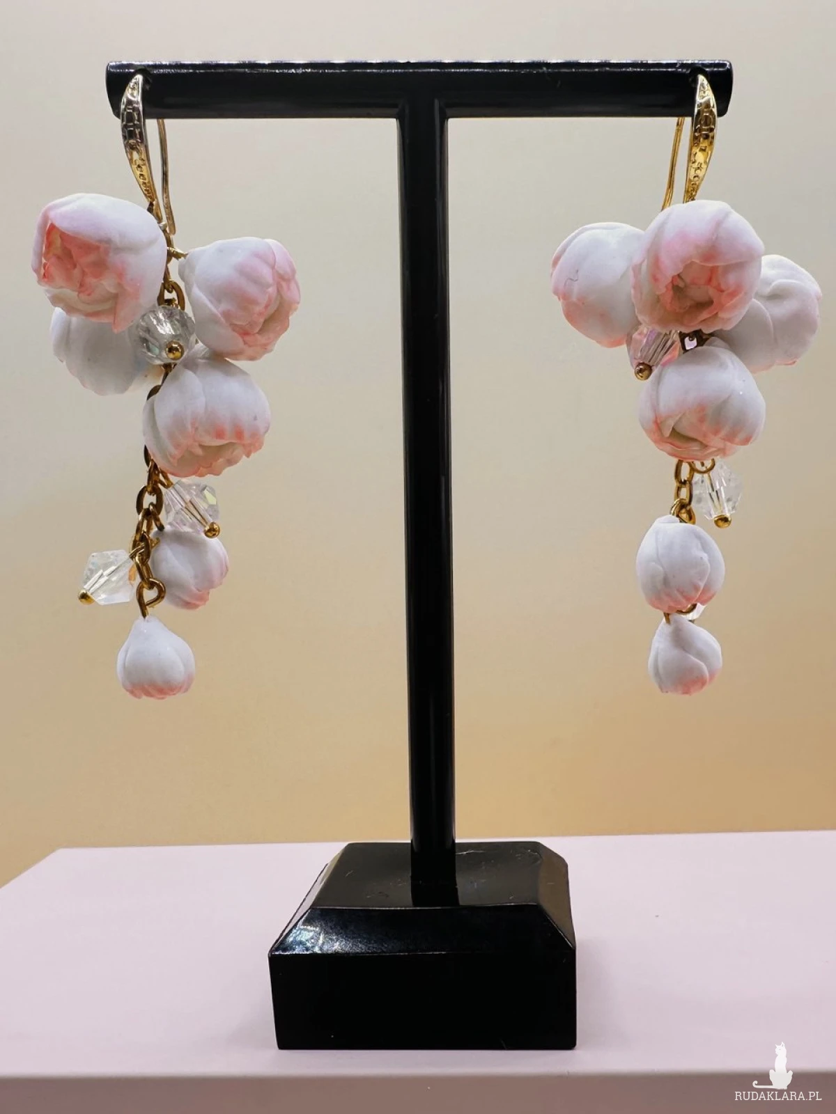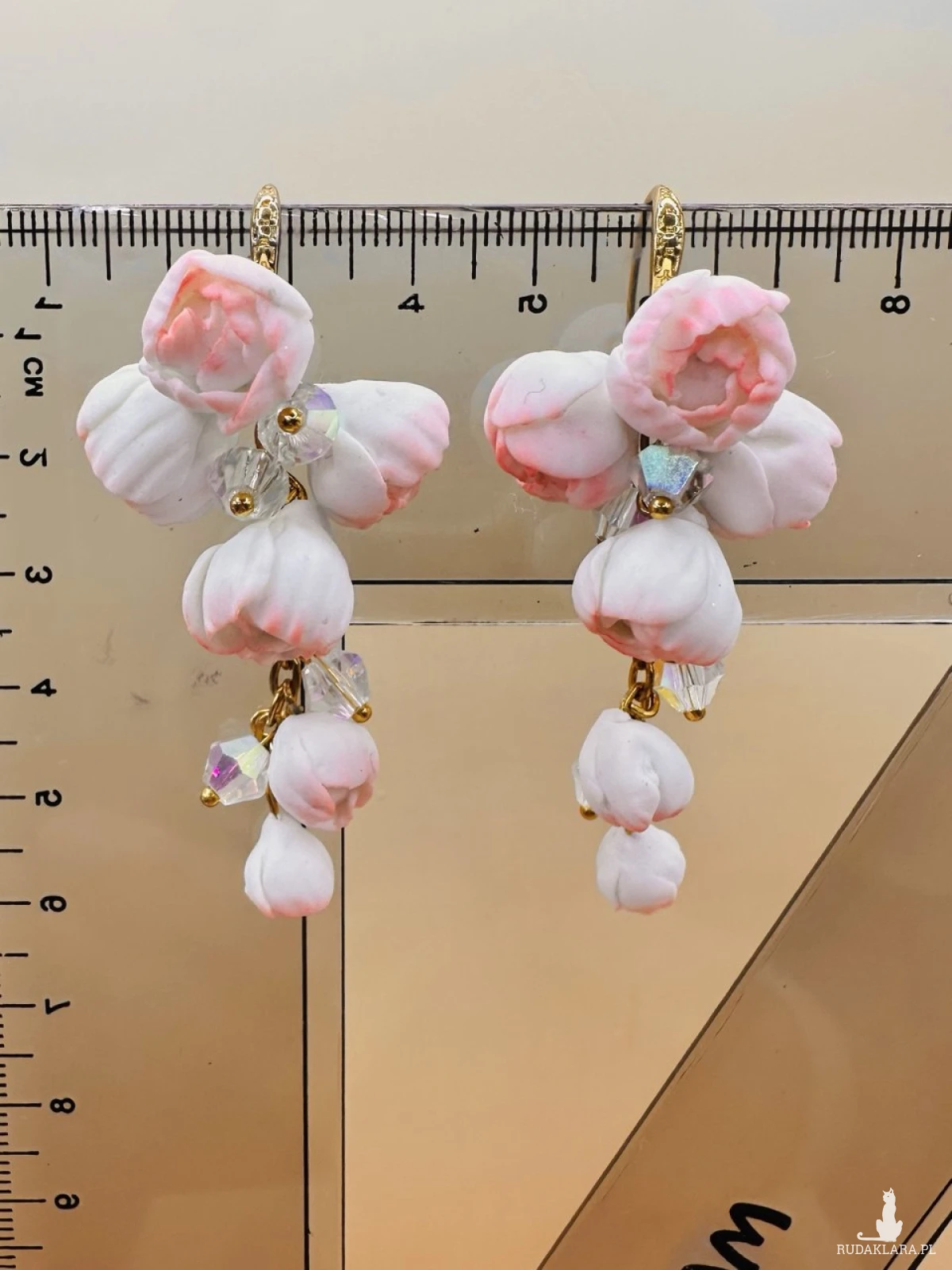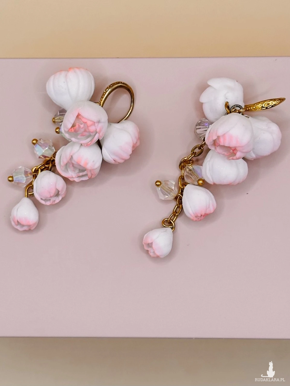 Przedstawiamy niezwykle subtelne i romantyczne kolczyki, które zachwycają swoją delikatnością. Każdy element został ręcznie uformowany z wysokiej jakości gliny polimerowej, co sprawia, że biżuteria jest niepowtarzalnym małym dziełem sztuki.Mimo bogatego, kaskadowego kształtu, kolczyki są niezwykle lekkie. Glina polimerowa to materiał, który nie obciąża płatków uszu, dzięki czemu możesz cieszyć się nimi przez cały dzień (i noc!) bez poczucia dyskomfortu.Pąki kwiatowe w odcieniach bieli z delikatnym, różowym rumieńcem zostały zestawione z lśniącymi kryształkami, które pięknie odbijają światło przy każdym ruchu.Złocone elementy wykończenia dodają całości szlachetnego charakteru, idealnie komponując się z pastelową kolorystyką kwiatów.Romantyczny, boho-chic, ślubny.Idealne na wyjątkowe okazje, wesela lub jako efektowny dodatek do letnich sukienek.