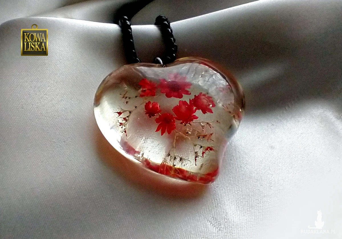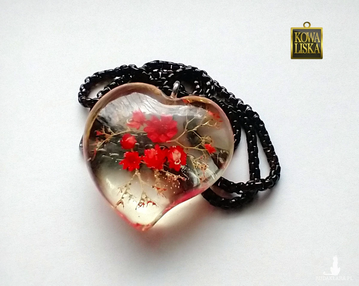 Duże, żywiczne serce z zatopionymi wewnątrz czerwonymi kwiatuszkami na cierniowych gałązkach.