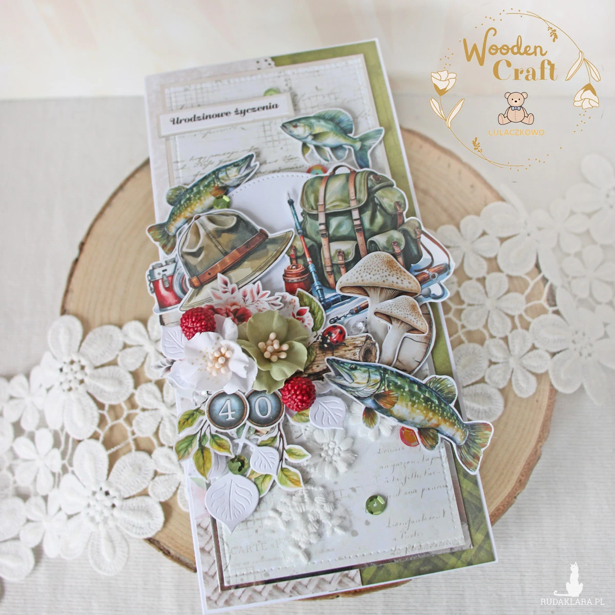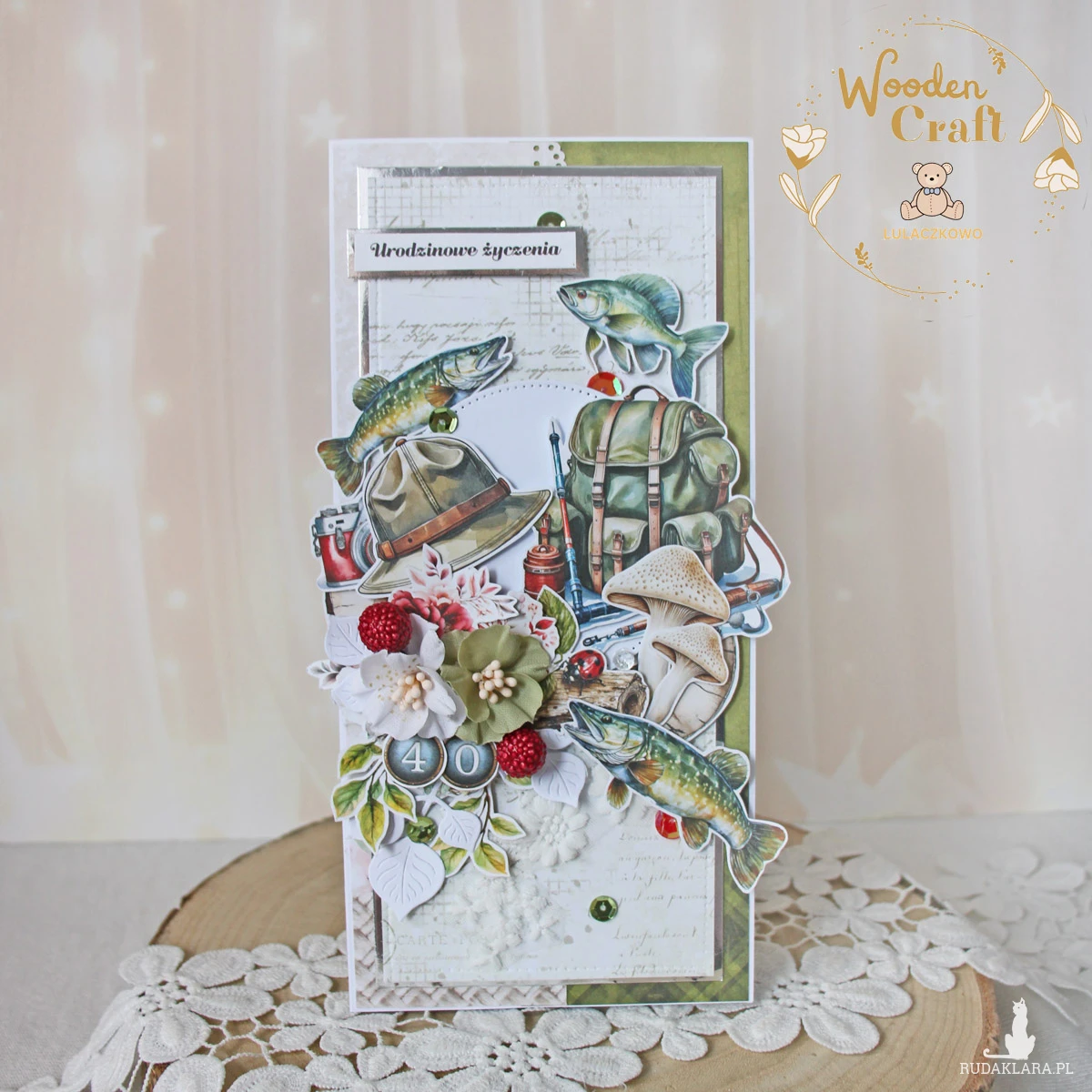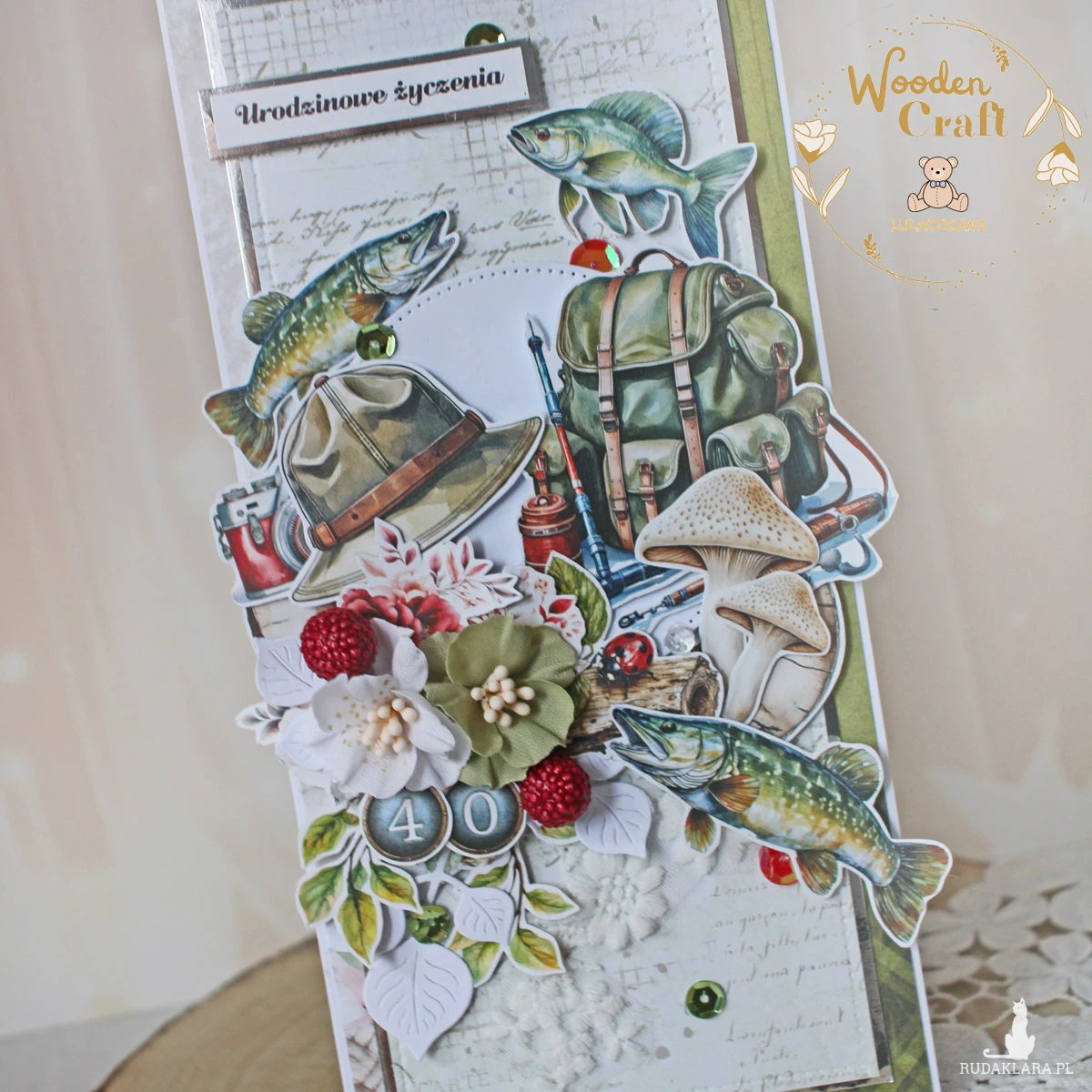 Nietuzinkowa, męska kartka urodzinowa, dla fana wędkarstwa. Utrzymana w odcieniach beżu, bieli i zieleni z dodatkiem błyszczących srebrnych akcentów, zamknięta w białym pudełeczku z okienkiem. Wykonana ręcznie z mixu męskich kolekcji papierów, ozdobiona licznymi grafikami o tematyce wędkarskiej, zielonymi cekinami, a także napisem "Urodzinowe życzenia" (do napisu mogę dodać również imię solenizanta oraz cyferki).