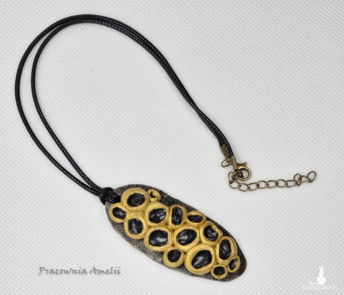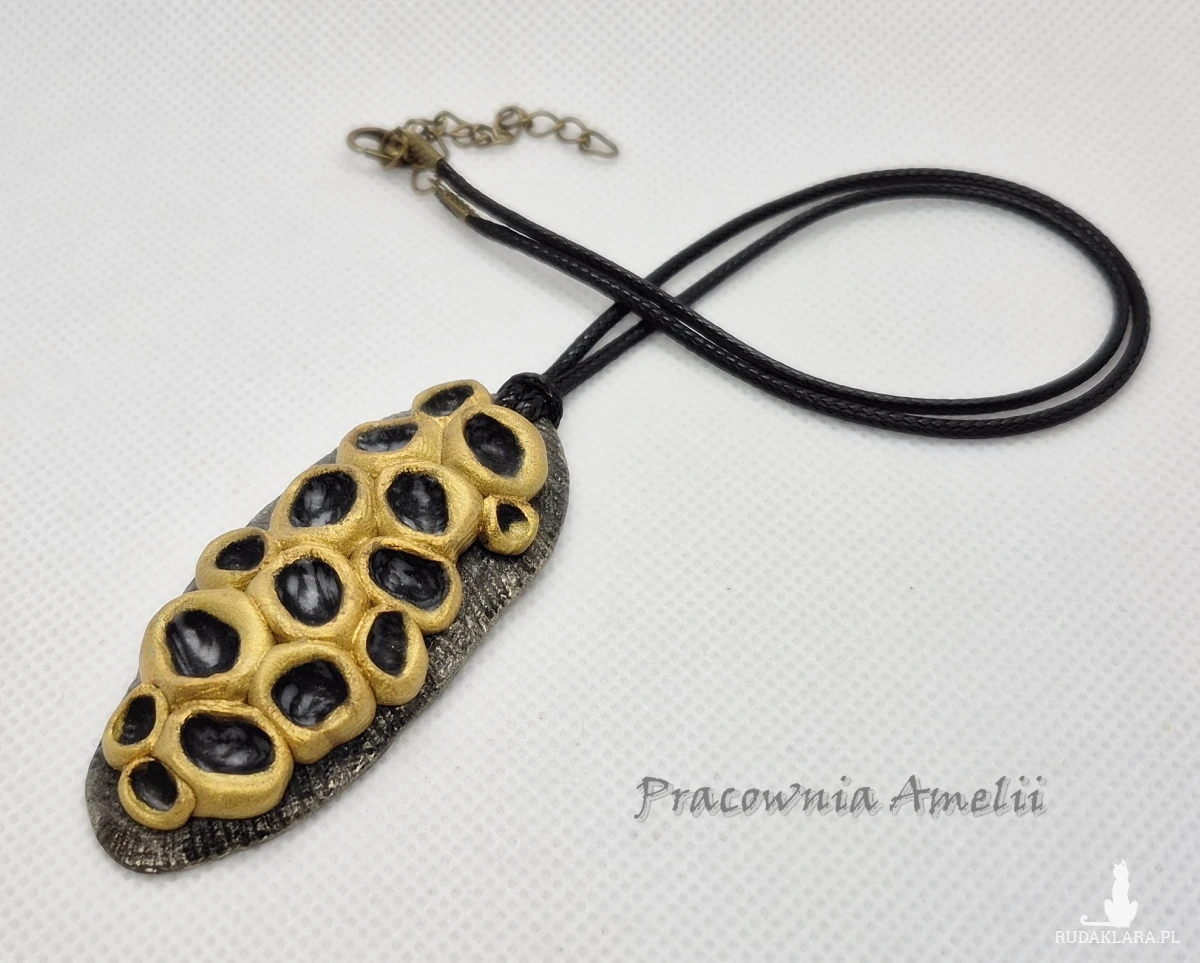 Wisior wykonany z gliny polimerowej zawieszony na czarnym powlekanym sznurku zapinanym na karabińczyk (z łańcuszkiem regulacyjnym). Wisior ma strukturę przywodzącą na myśl plaster miodu lub suszony kwiat lotosu. Ładnie prezentuje się na dekolcie. Projekt własny, wykonany tylko w jednym egzemplarzu. Biżuteria z gliny polimerowej jest trwała i uniwersalna. Idealna na oryginalny prezent w atrakcyjnej cenie.