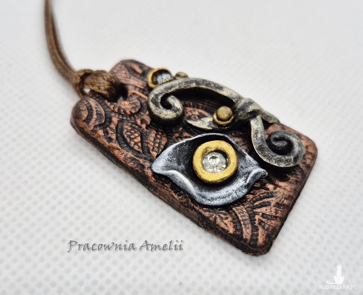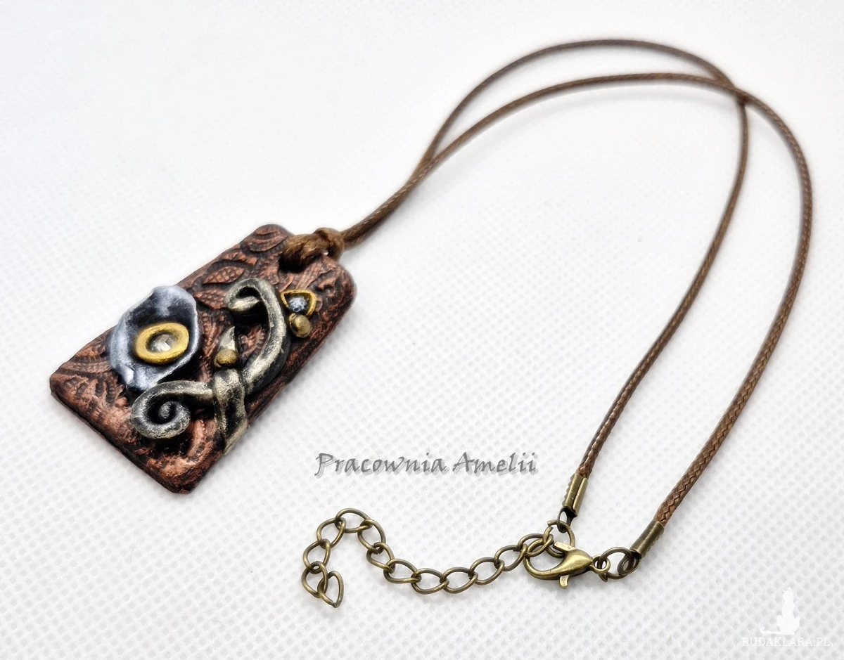 Wisior wykonany z gliny polimerowej zawieszony na brązowym powlekanym sznurku zapinanym na karabińczyk (z łańcuszkiem regulacyjnym). Ładnie prezentuje się na dekolcie. Projekt własny, wykonany tylko w jednym egzemplarzu. Biżuteria z gliny polimerowej jest trwała i uniwersalna. Idealna na oryginalny prezent w atrakcyjnej cenie.