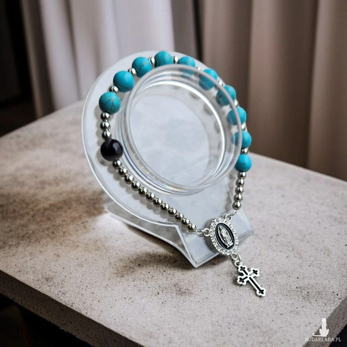 Wyjątkowa bransoletka łącząca delikatność z głębokim znaczeniem. Wykonana z turkusowych koralików oraz srebrnych kuleczek, ozdobiona medalikiem z wizerunkiem Matki Bożej i subtelnym krzyżykiem. Całość tworzy harmonijną, elegancką kompozycję, idealną zarówno na co dzień, jak i na wyjątkowe okazje.
