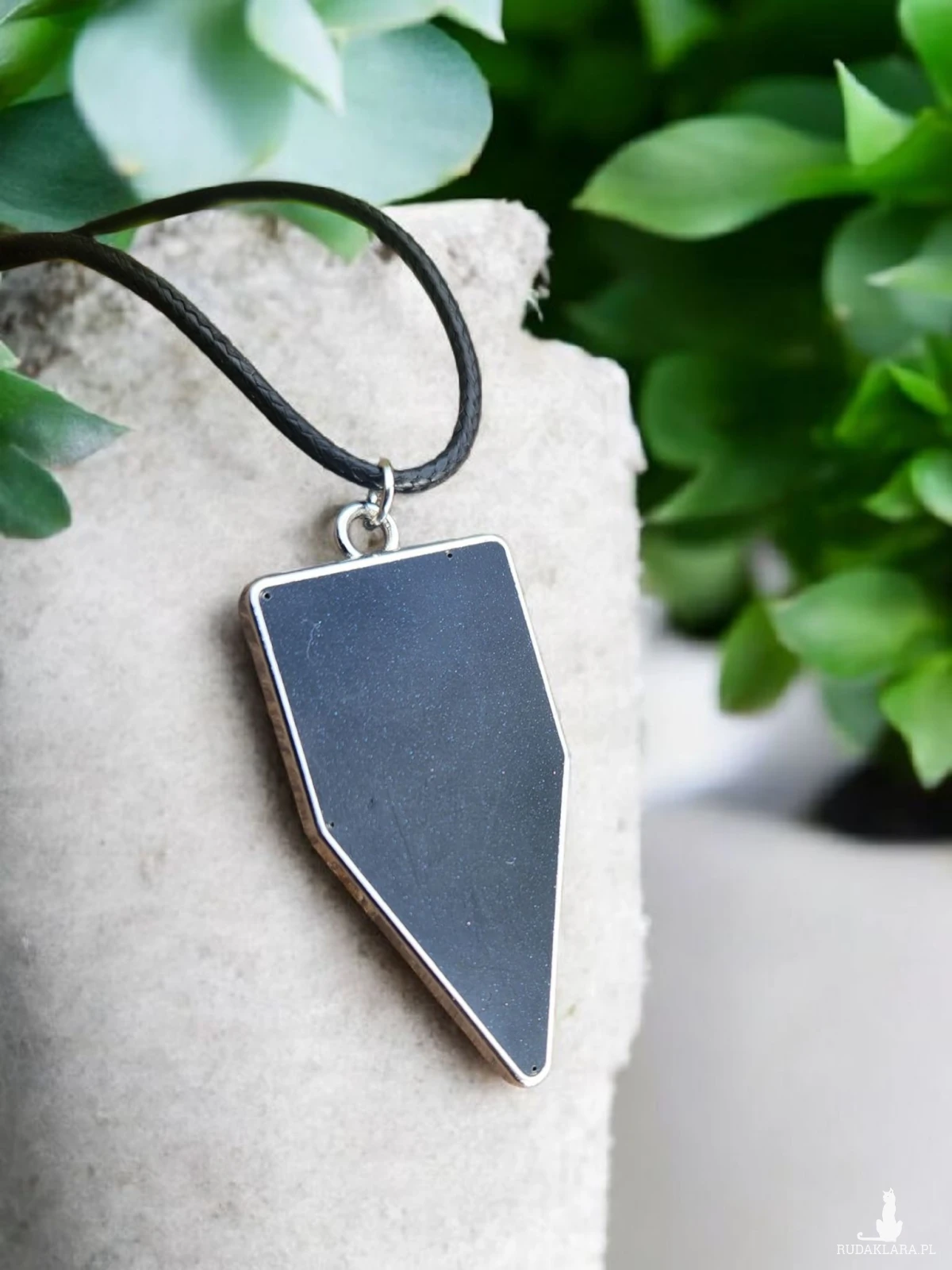 Minimalistyczna oprawa w srebrnym kolorze podkreśla nowoczesną formę wisiorka, a czarny, pleciony rzemyk dodaje całości lekkości i uniwersalności. Naszyjnik doskonale komponuje się zarówno z codziennymi stylizacjami, jak i eleganckim strojem wieczorowym.