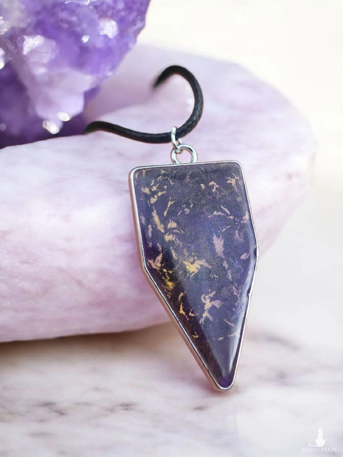 Wyjątkowy naszyjnik z żywicy artystycznej w eleganckim, geometrycznym kształcie to propozycja dla osób ceniących oryginalną biżuterię z charakterem. Ręcznie wykonana zawieszka zachwyca głębokim odcieniem fioletu, w którym zatopione zostały subtelne, złote akcenty tworzące niepowtarzalny, abstrakcyjny wzór. Każdy egzemplarz jest jedyny w swoim rodzaju – układ barw i refleksów nigdy się nie powtarza.