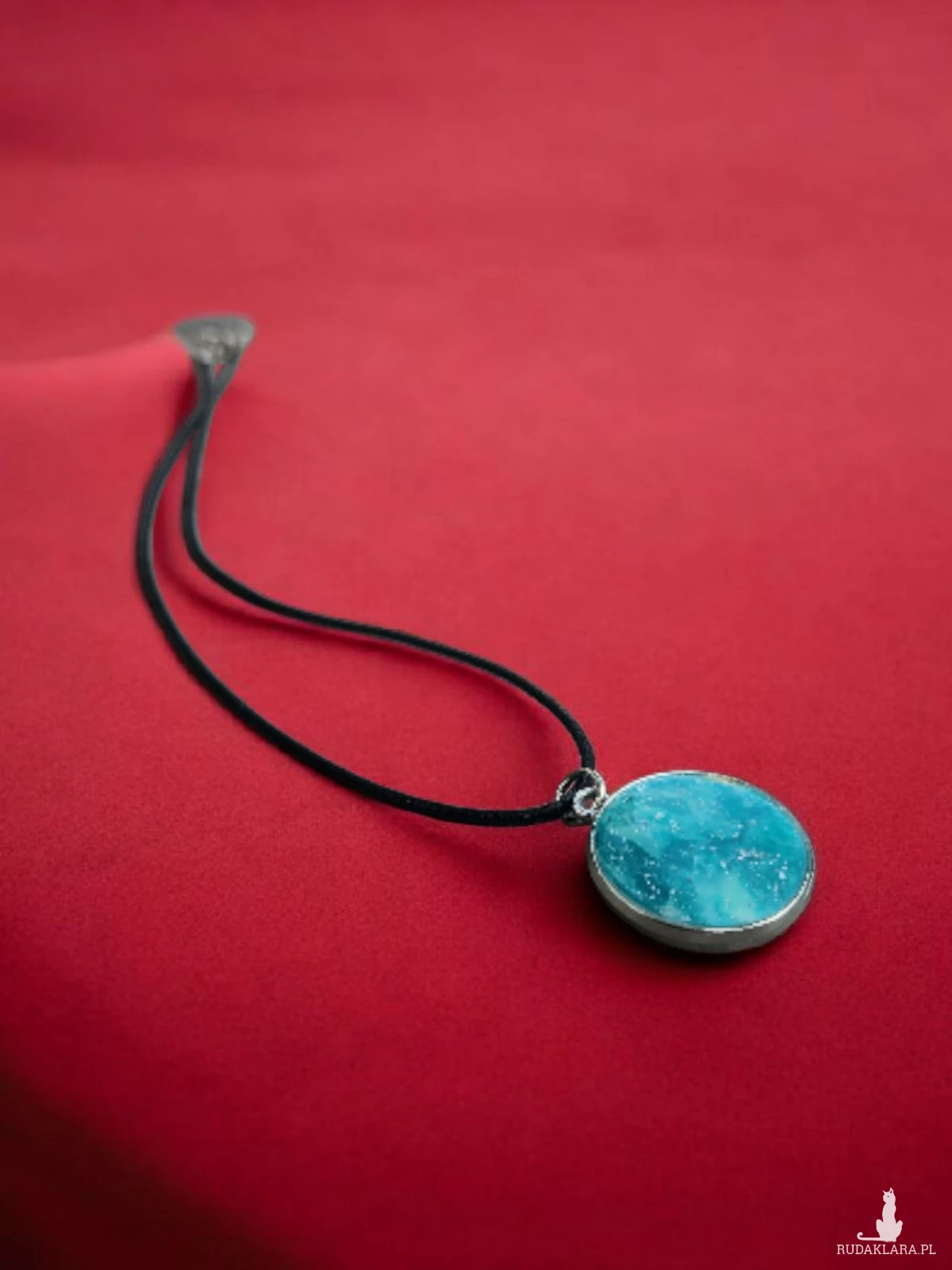 Wisiorek ma średnicę 2,5 cm i jest oprawiony w solidną bazę, zawieszony na czarnym rzemyku o regulowanej długości 44–50 cm. Jest lekki, wygodny w noszeniu i idealny jako prezent dla miłośników unikatowej biżuterii handmade.
