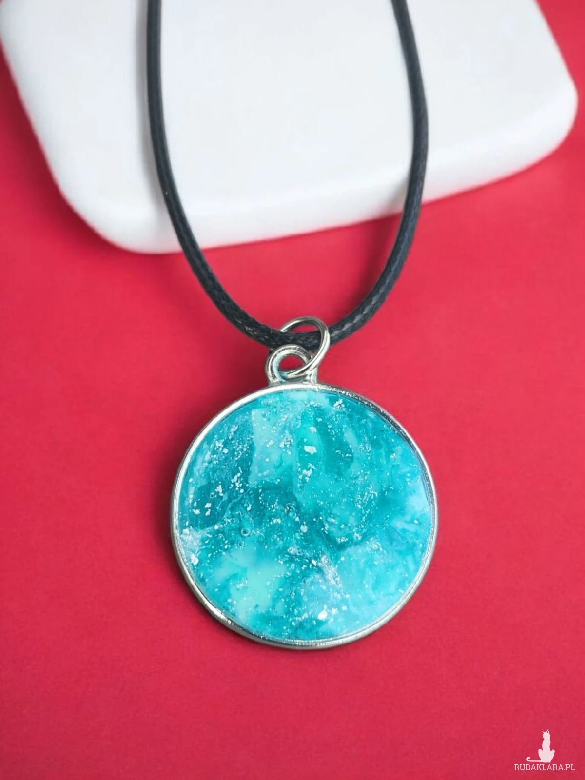 Ten wyjątkowy wisiorek został wykonany ręcznie z połączenia żywicy epoksydowej i gliny polimerowej, tworząc niepowtarzalny, turkusowy wzór przypominający morską taflę. Każdy element jest tworzony osobno, dzięki czemu nie ma dwóch identycznych egzemplarzy – otrzymujesz prawdziwy one of a kind.