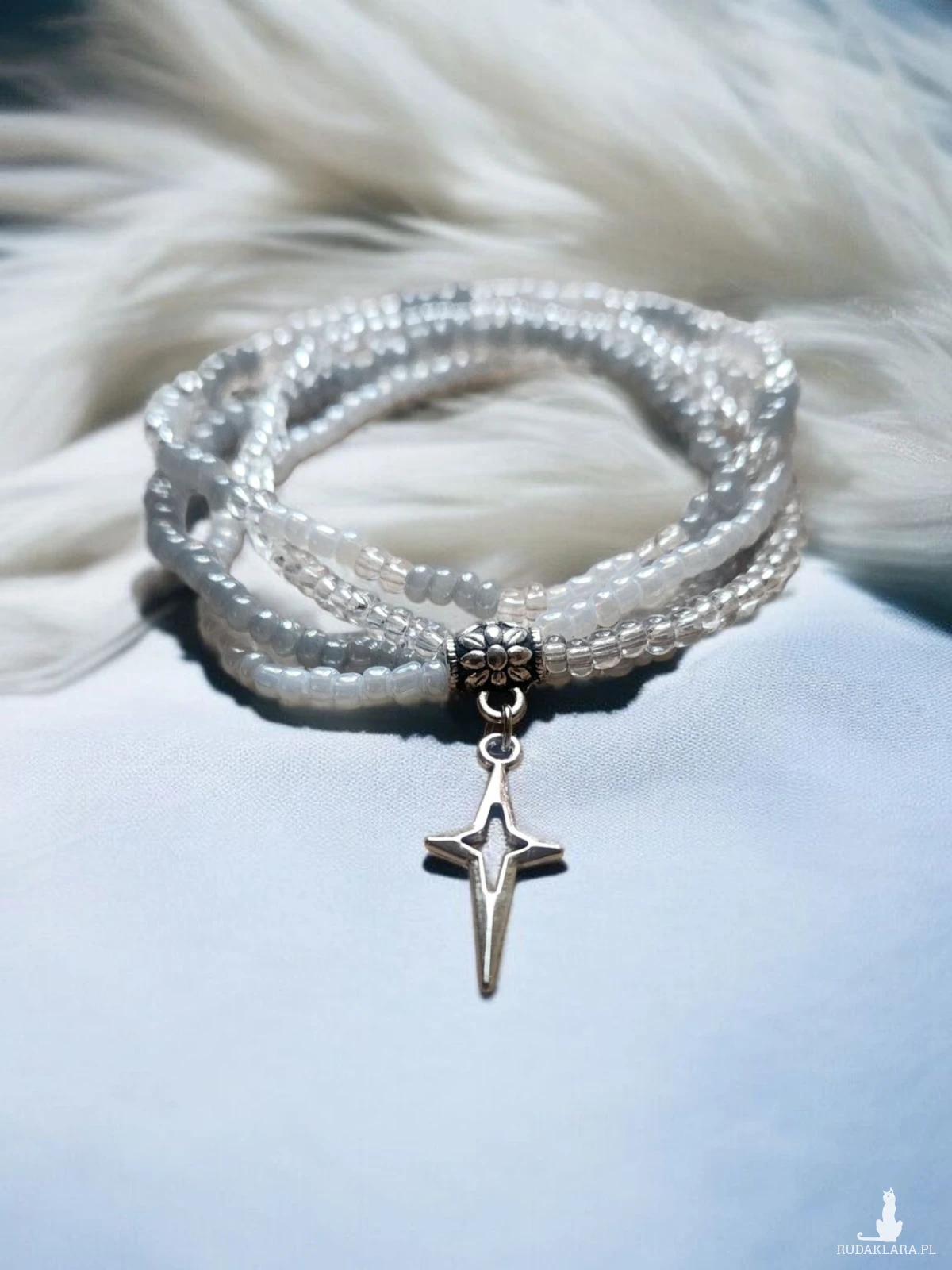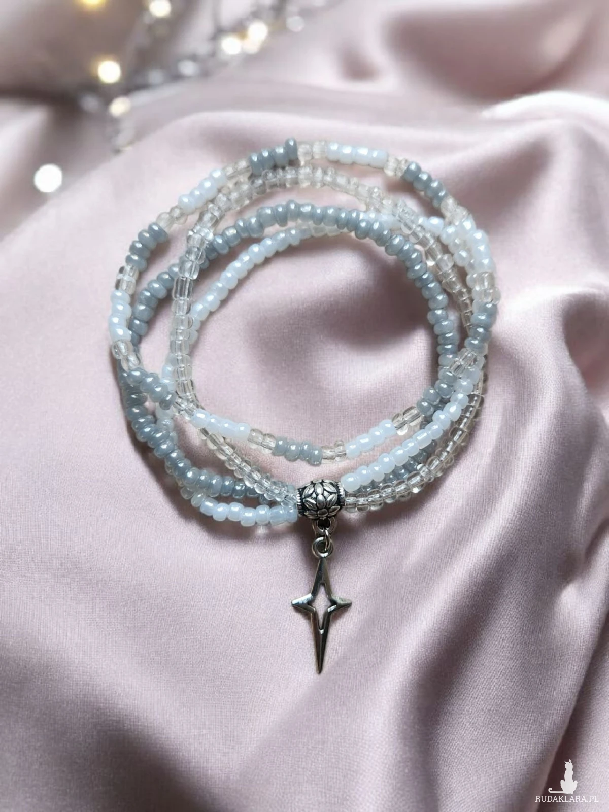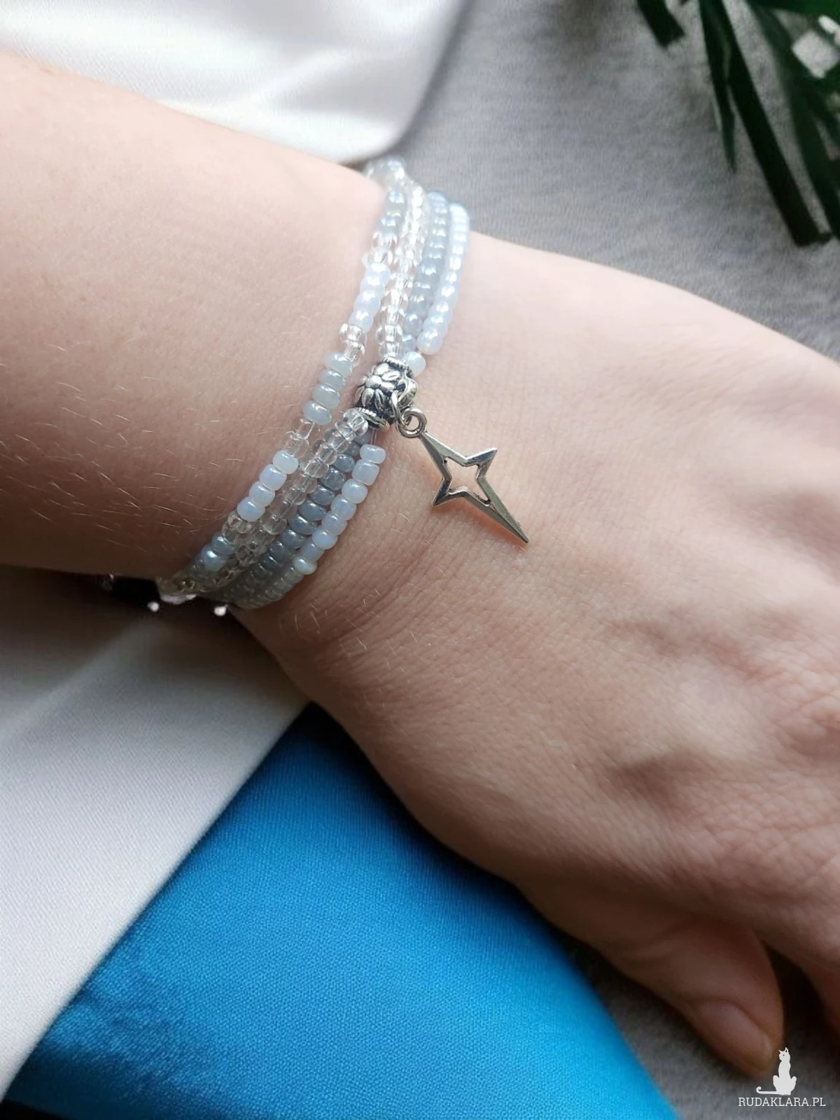 Delikatna, wielowarstwowa bransoletka wykonana ręcznie z mieszanki jasnoniebieskich, mlecznych i przezroczystych koralików. Subtelnie połyskują w świetle, tworząc elegancki i kobiecy efekt. Bransoletkę zdobi srebrzysta zawieszka w kształcie gwiazdy oraz dekoracyjny koralik.