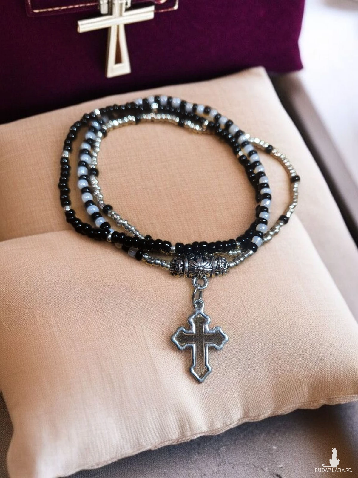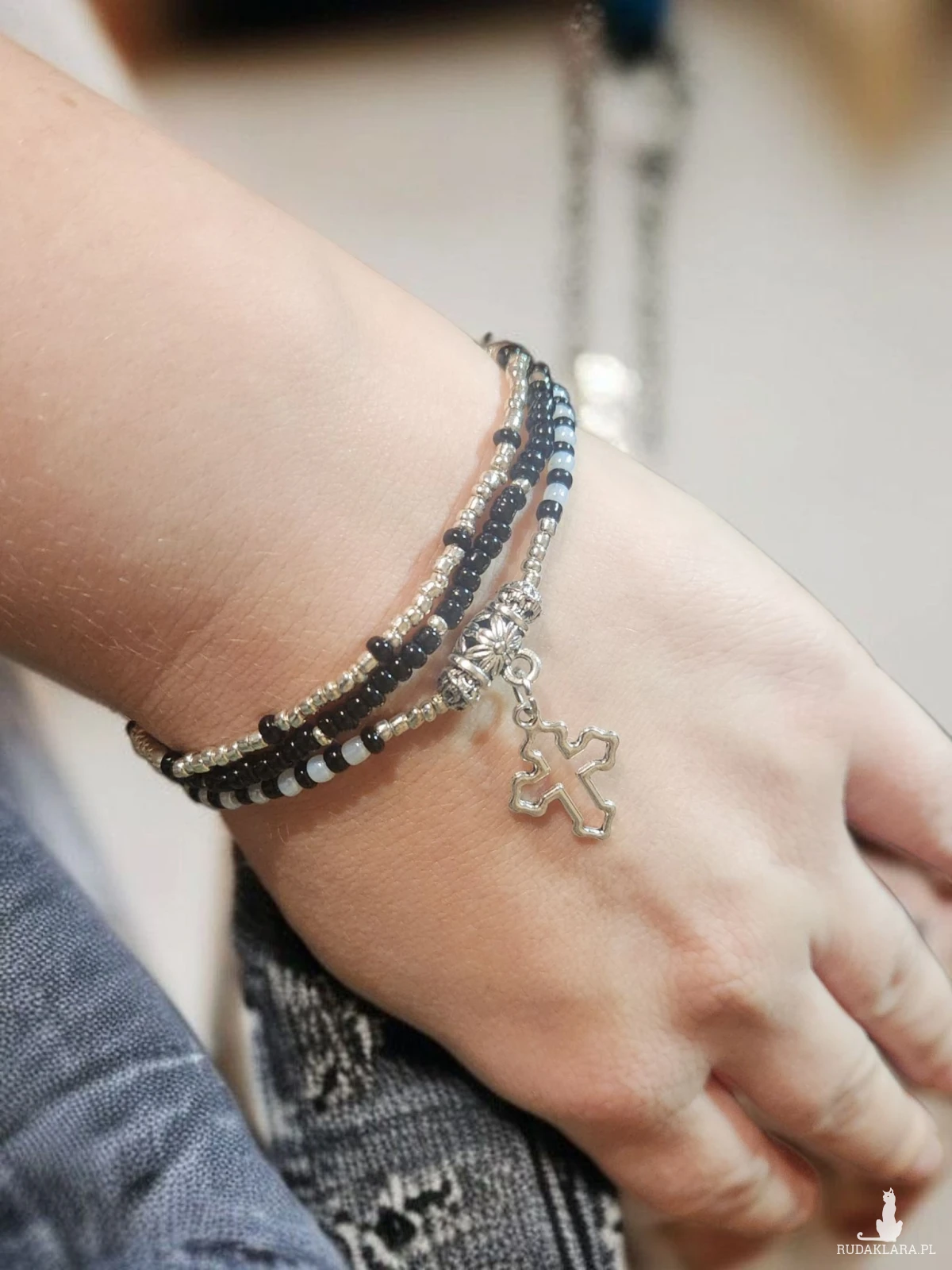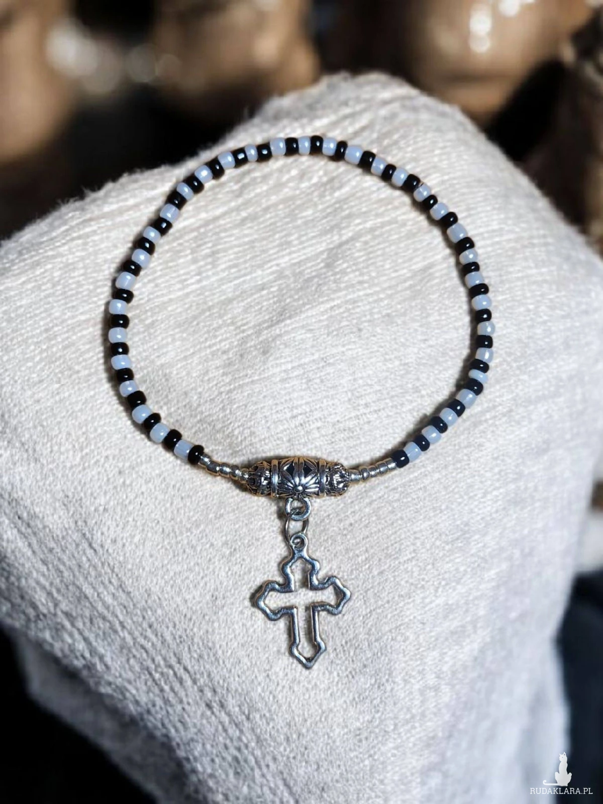 Dodaj odrobinę elegancji i symboliki do swojej codziennej stylizacji dzięki tej ręcznie robionej bransoletce z drobnych koralików. Delikatne czarne, srebrne i jasnoszare koraliki tworzą harmonijną kompozycję, a centralnym punktem jest pięknie zdobiona zawieszka w kształcie krzyża. Bransoletka jest elastyczna, dzięki czemu wygodnie dopasowuje się do nadgarstka.