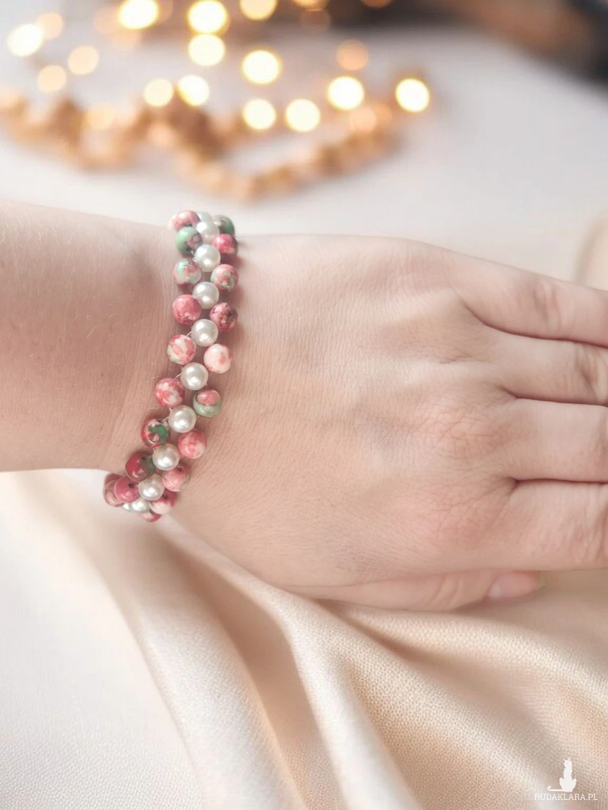 Wprowadź do swojej biżuteryjnej kolekcji odrobinę subtelnego uroku! Ta ręcznie wykonana bransoletka zachwyca połączeniem klasycznych, perłowych koralików z unikatowymi marmurkowymi koralikami w różu, zieleni i delikatnym kremie. Ich nieregularne wzory sprawiają, że każda bransoletka jest jedyna w swoim rodzaju.