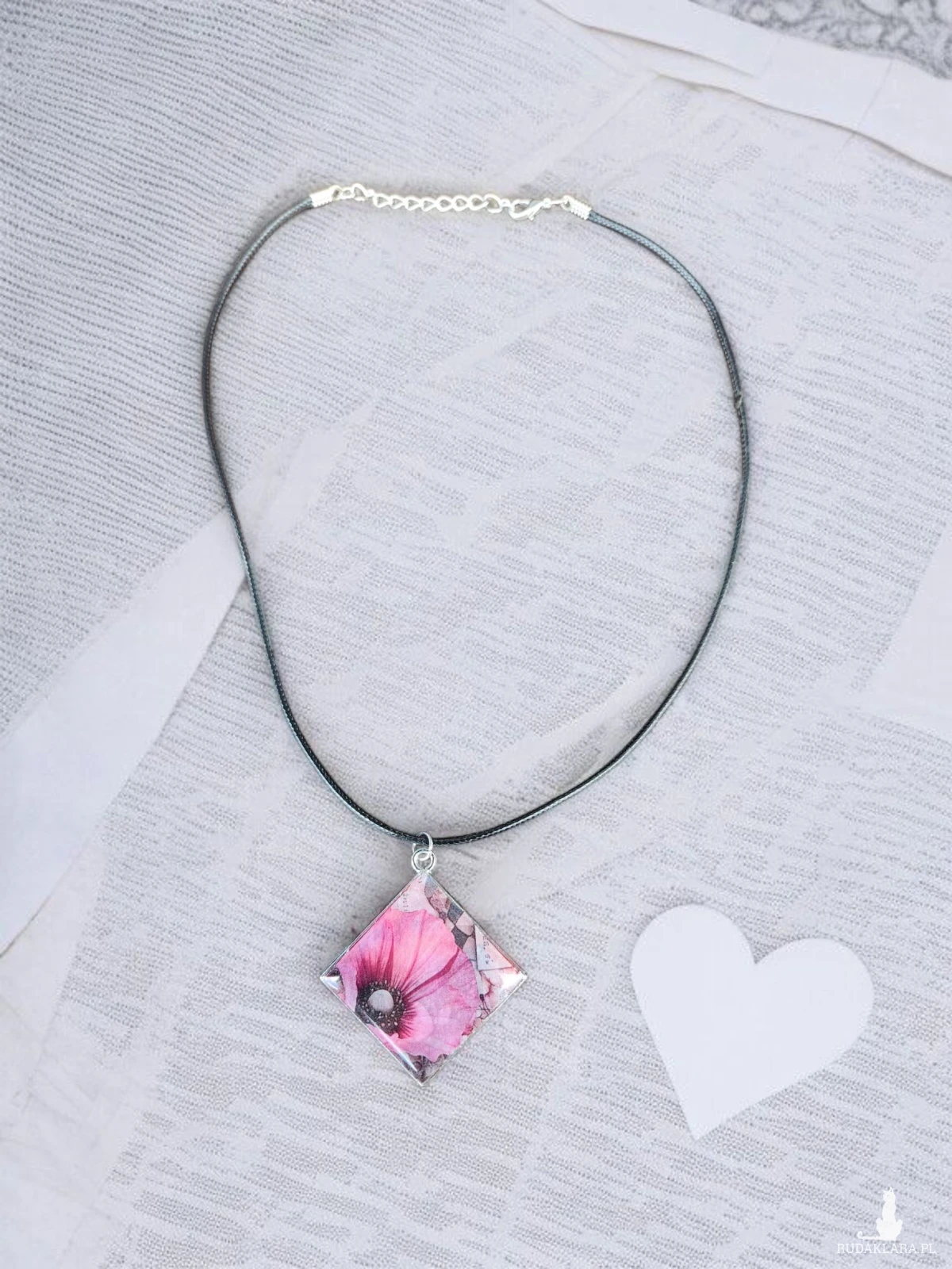 Zawieszka wykonana jest z przezroczystej żywicy, w której zatopiony jest motyw kwiatowy – duży, różowy kwiat przypominający mak lub anemon, z ciemniejszym środkiem i subtelnym tłem w odcieniach różu oraz beżu. Brzegi zawieszki są oprawione w metalową ramkę o srebrnym kolorze, co dodaje całości delikatnego blasku.