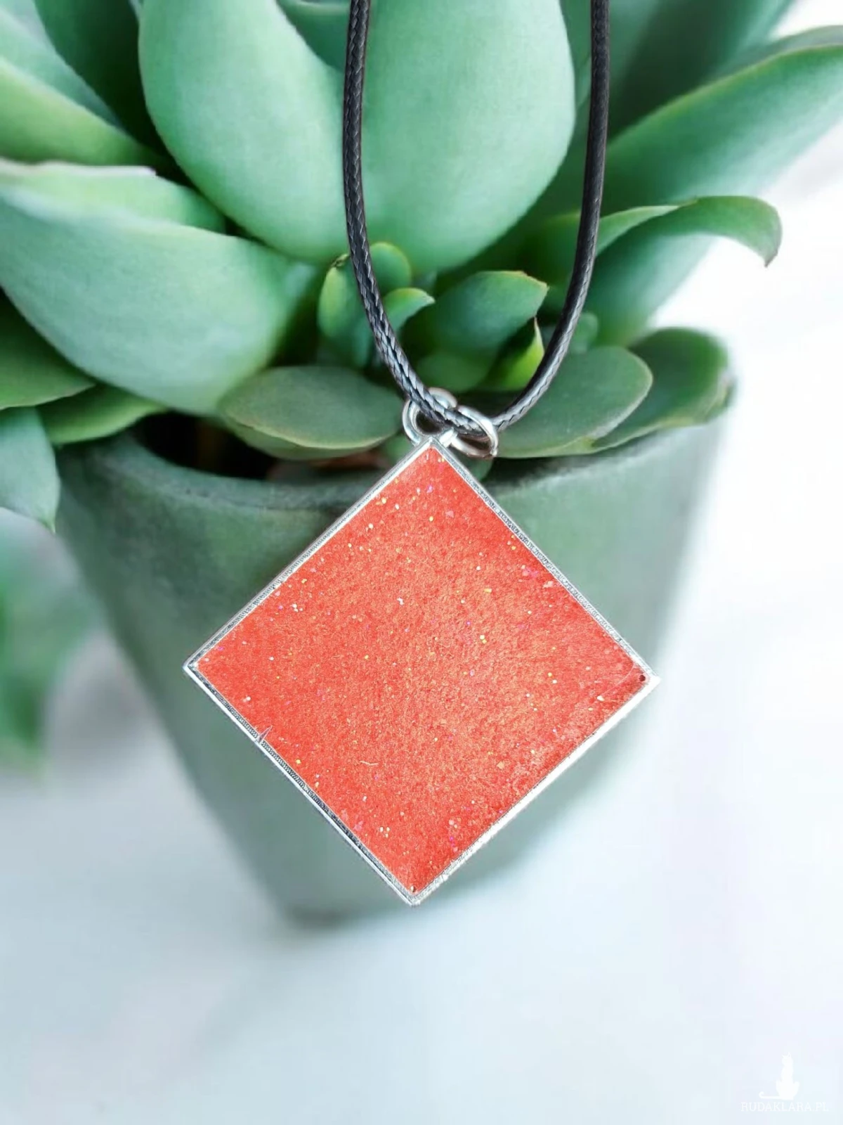 Wisiorek ma kształt kwadratu o wymiarach 3 cm x 3 cm, oprawiony w delikatną, srebrzystą ramkę. Zawieszony jest na czarnym rzemyku o długości 44 cm, który wygodnie układa się na szyi.