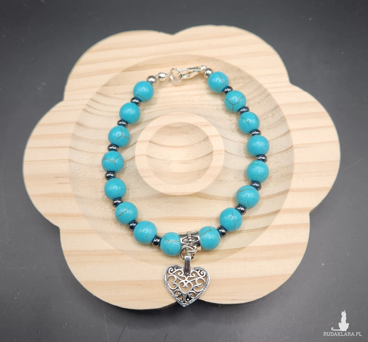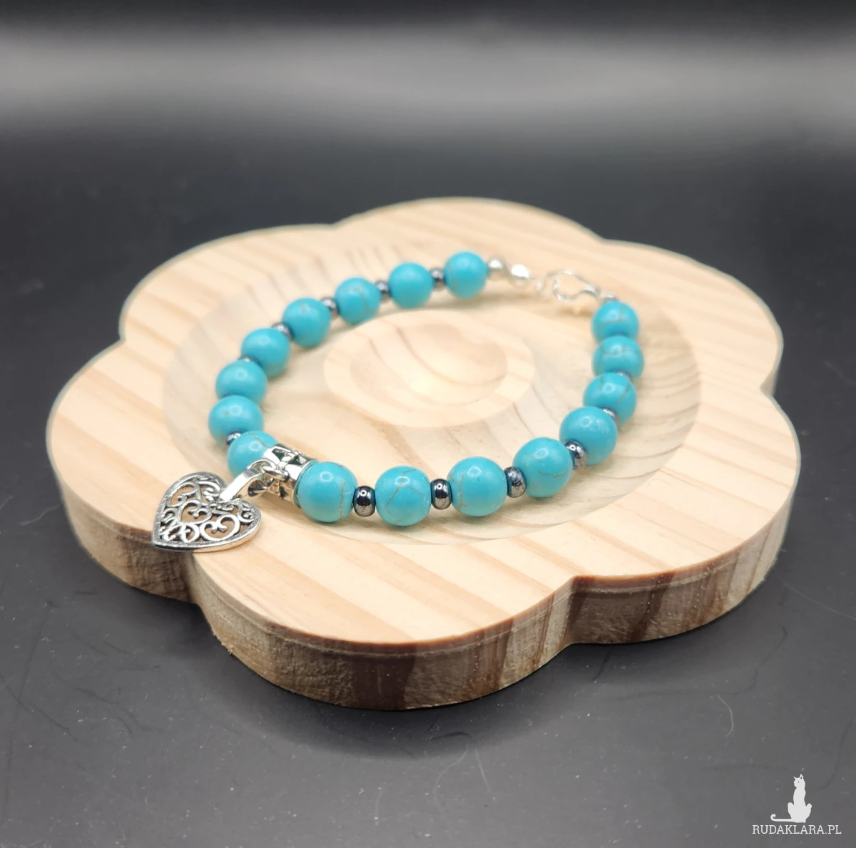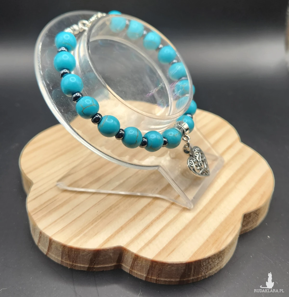 Na sprzedaż oferuję piękną, ręcznie wykonaną bransoletkę z koralików w intensywnym kolorze turkusowym. Bransoletka charakteryzuje się eleganckim połączeniem matowych kamieni z metalowymi elementami ozdobnymi, co nadaje jej wyjątkowego charakteru.