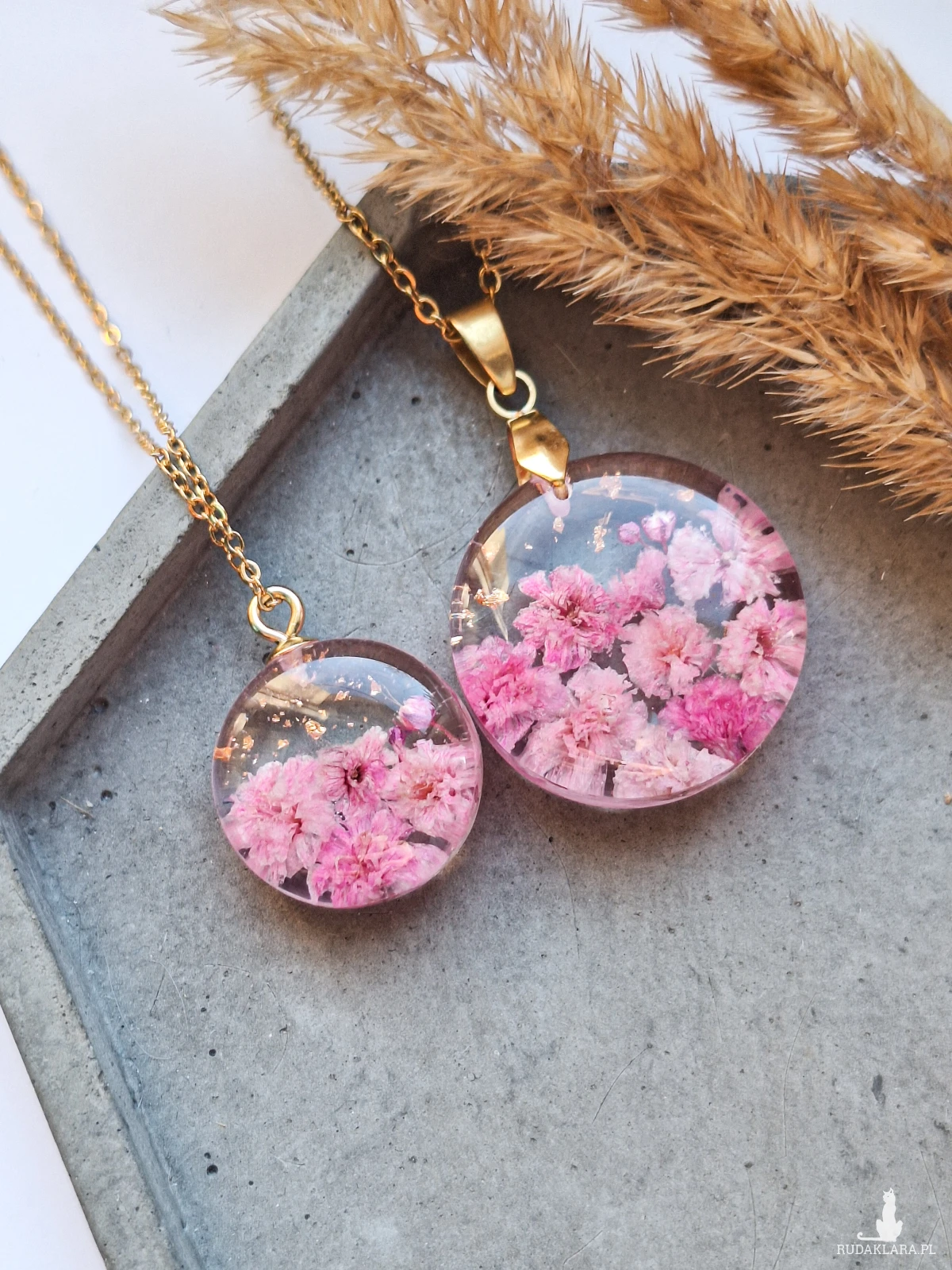 Uroczy wisiorek z zatopionymi kwiatami różowej gipsówki i płatkami złota. Wykonany z wysokiej klasy żywicy, która nie zmienia koloru pod wpływem promieniowania uv oraz wysokiej jakości stali chirurgicznej. Dostępny jest też taki sam wisiorek w większym rozmiarze, kolczyki i bransoletka.