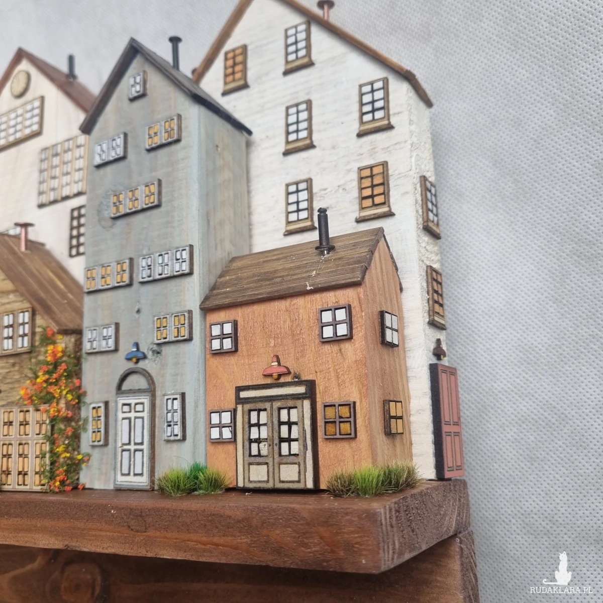 Drewniane domki handmade, mogące służyć jako wieszak na klucze (5), ręczniki inne drobiazgi. Domki wykonane desek ze starych palet z odzysku. Drewno bejcowane, woskowane, malowane w różnych odcieniach - ładnie podkreślające starość drewna - malowane bezbarwną farbą akrylową. Drewniane, wycinane okna i drzwi, również inne detale. Długość 41 cm, wysokość 30 cm, szerokość 7 cm . Całość do zawieszenia na ścianie na 2 hakach. (18)