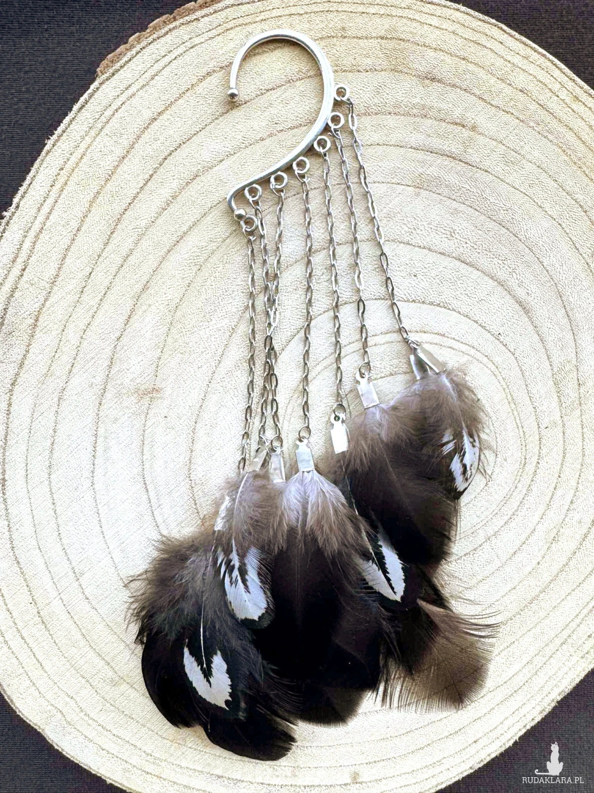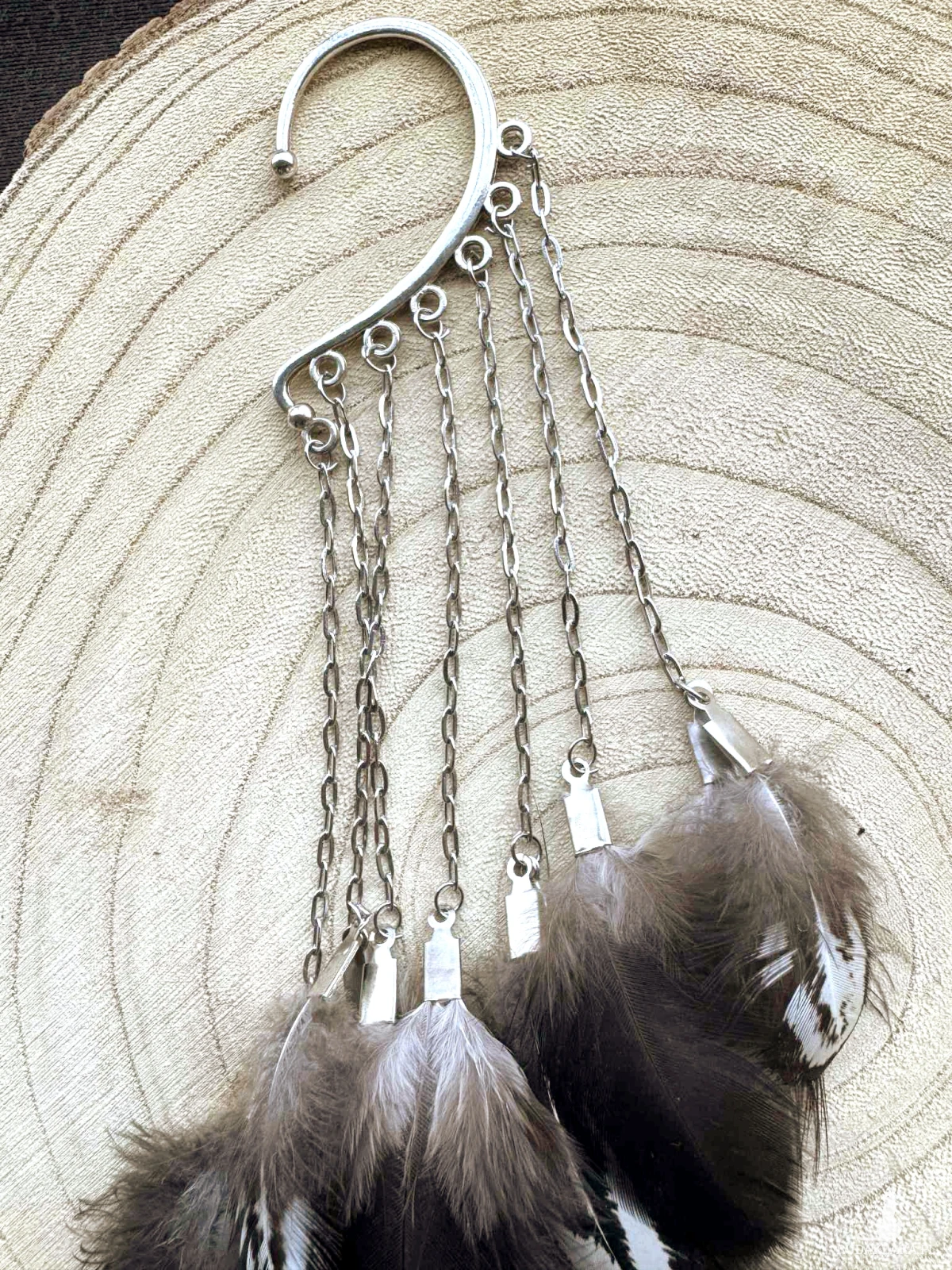 Nausznica z naturalnymi piórami, zakładana za ucho, nie wymaga przekłucia. Nowa. Stelaż metalowy, srebrny. Długość 16 cm.